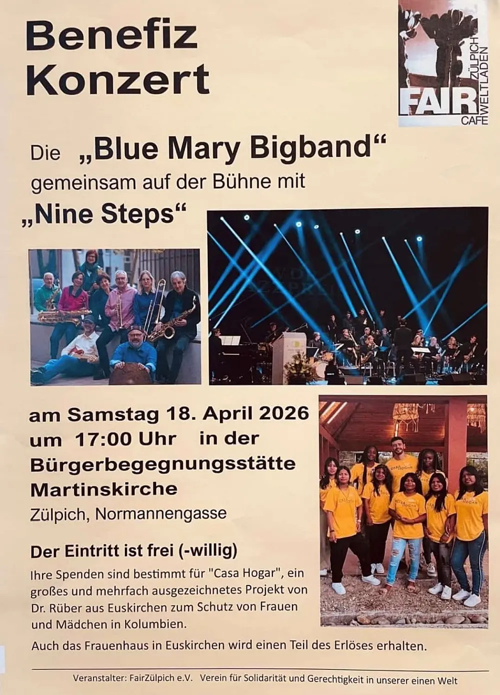 Am Samstag, 18. April 2026, findet um 17:00 Uhr in der Bürgerbegegnungsstätte Martinskirche Zülpich ein Benefizkonzert zugunsten sozialer Projekte statt.Auf der Bühne stehen die Blue Mary Bigband und Nine Steps,[…]