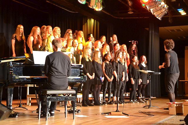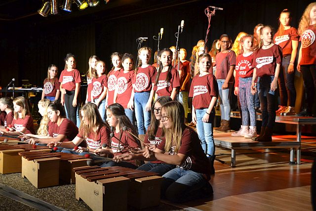 Ähnlich professionell zeigten sich auch die übrigen Akteure der elften Vocalnight der Marienschule Euskirchen. Lediglich drei Monate Übungszeit standen den Sängerinnen und Sängern des Chores „Singsons“ vor ihrem ersten Auftritt zur Verfügung. „Alle Schüler gehen wirklich sehr souverän mit der Situation um“, lobte Chorleiter Barbara Luke. „Trotz ihres jungen Alters stehen sie ohne Notenblätter im Rampenlicht und liefern eine tolle Show ab.“ Die Fünft- und Sechstklässler, die teilweise erst seit den Sommerferien zu dem Ensemble gestoßen waren, zeigten keine Spur von Unsicherheit. Angefangen bei dem Hit der 1970er Jahre „Die Roboter“ von Kraftwerk bis hin zu aktuellen Chartstürmern wie „Sowieso“ von Mark Foster präsentierten sie trotz der Kürze der Zeit bereits ein breites Repertoire.