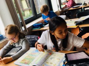 Verändert hat sich der Unterricht in mehrfacher Hinsicht. Das Internet ist aus dem Klassenraum erreichbar, wenn auch leider unzuverlässig. Für Recherchen muss kein Computerraum mehr für die gesamte Stunden gebucht werden; die Schüler(innen) nutzen schnell „Safari“. Auch unsere Lernplattform „Moodle“ kann jederzeit eingesetzt werden; mit ihr arbeiten die Schüler(innen) im Deutschunterricht regelmäßig, um in ihrem individuellen Tempo Aufgaben auf einem für sie passenden Niveau zur Verbesserung ihrer Rechtschreibleistung zu bearbeiten. Viel Spaß hatte die Klasse bei der Wiederholung grammatischer Fachbegriffe mit Hilfe eines „Kahoot“-Quiz.