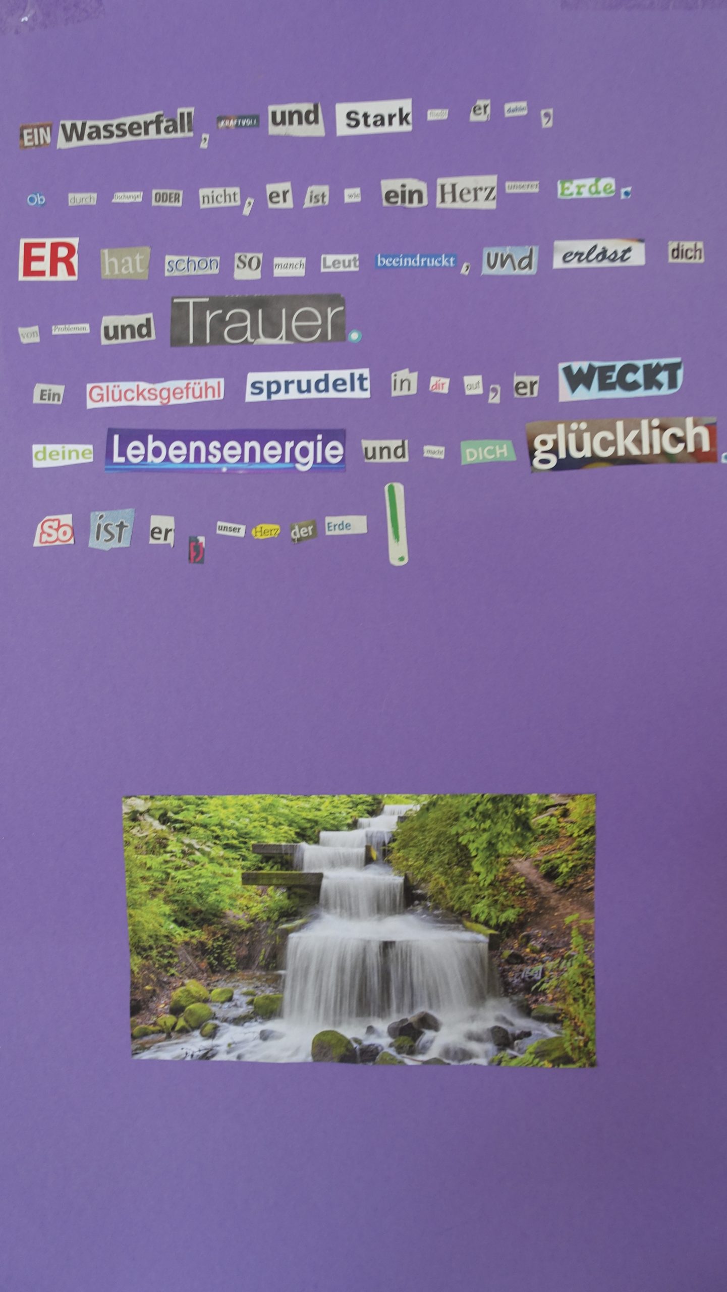 Die Ergebnisse sind beachtlich: Laura und Marlene verbreiten mit ihrem Gedicht „Ein Wasserfall“ Mut und Zuversicht, denn beides brauchen wir Menschen während der Pandemie ganz besonders. Elisabeth und Milena erstellten ein Gedicht, das auf die Klimakrise aufmerksam macht, um dazu beizutragen, dass das Thema „Klimawandel“ während der Corona-Krise nicht unter den Tisch fällt. Benjamin und Mika drücken mit ihrer bunten, fröhlichen Collage aus, dass es großen Spaß macht, draußen Sport zu treiben – ein ganz wichtiges Gegengewicht zum langen Sitzen während des Distanzlernens!