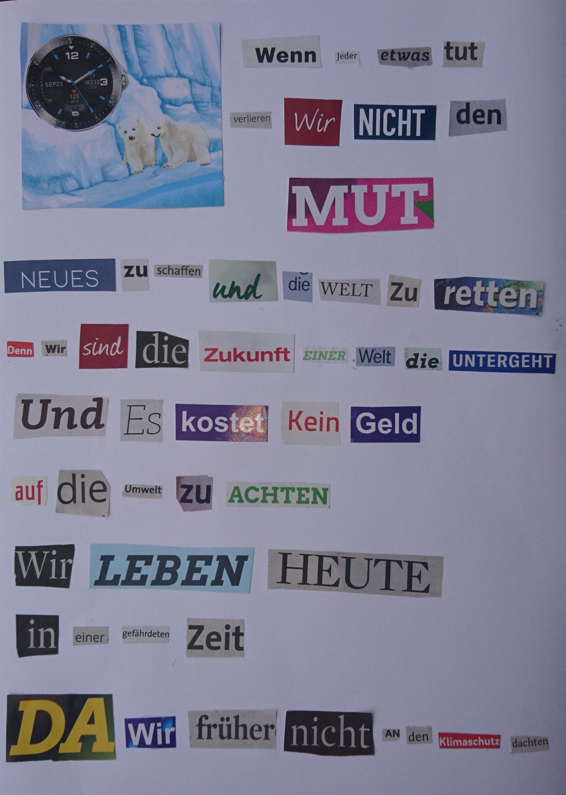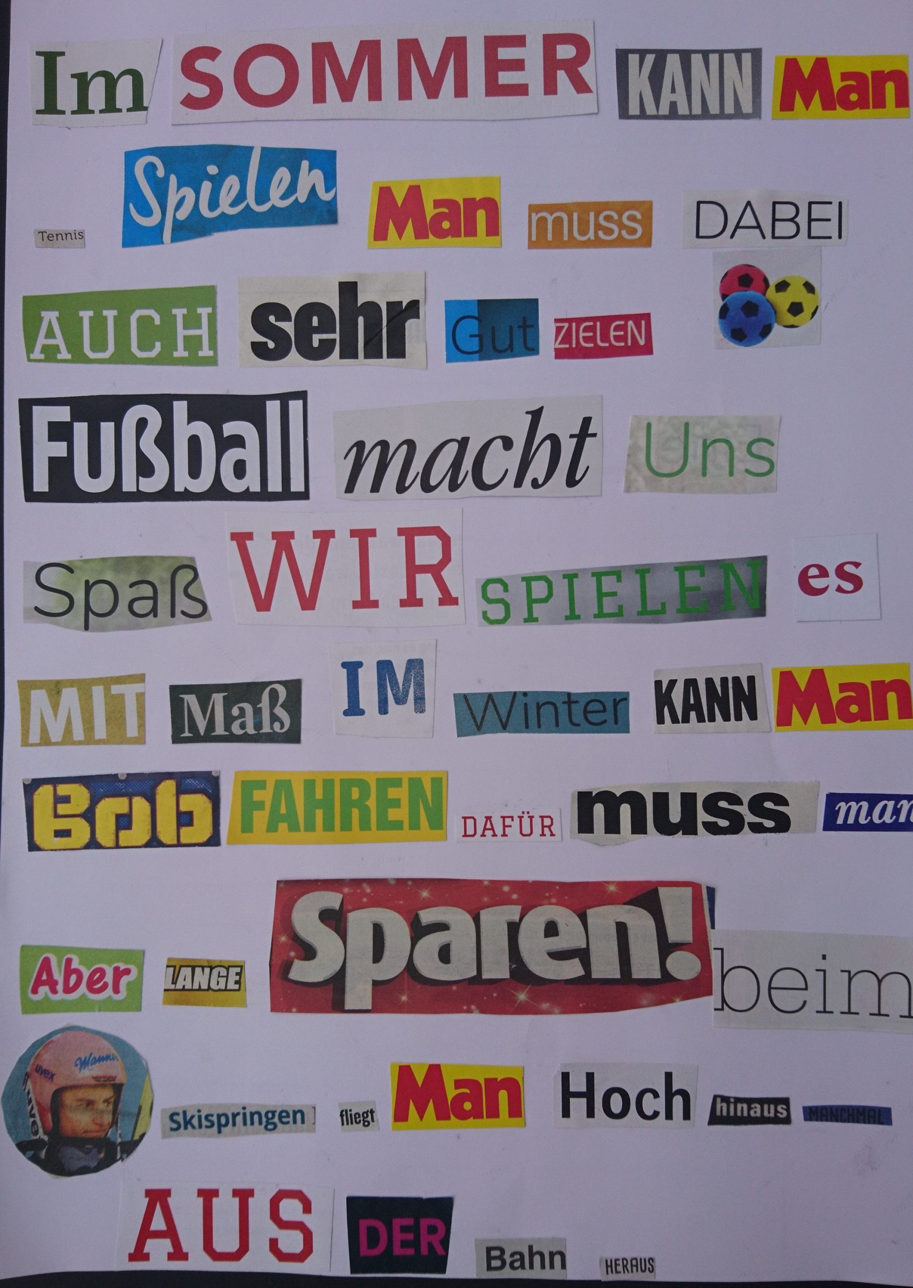 Im Rahmen des Deutschunterrichts erfuhr die Klasse 6b vom Leben der Schriftstellerin Herta Müller. Die Familie der Literaturnobelpreisträgerin gehörte zur deutschsprachigen Minderheit in Rumänien. Als Kritikerin des Ceausescu-Regimes wurde sie von der Geheimpolizei bedroht und reiste in die Bundesrepublik Deutschland aus. Die Schülerinnen und Schüler der 6b untersuchten gruppenweise Wort-Bild-Collagen der Dichterin, die Wörter aus Zeitungen und Zeitschriften ausschneidet, alphabetisch sortiert und daraus Gedichte zusammenstellt.