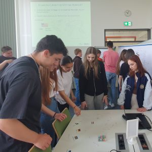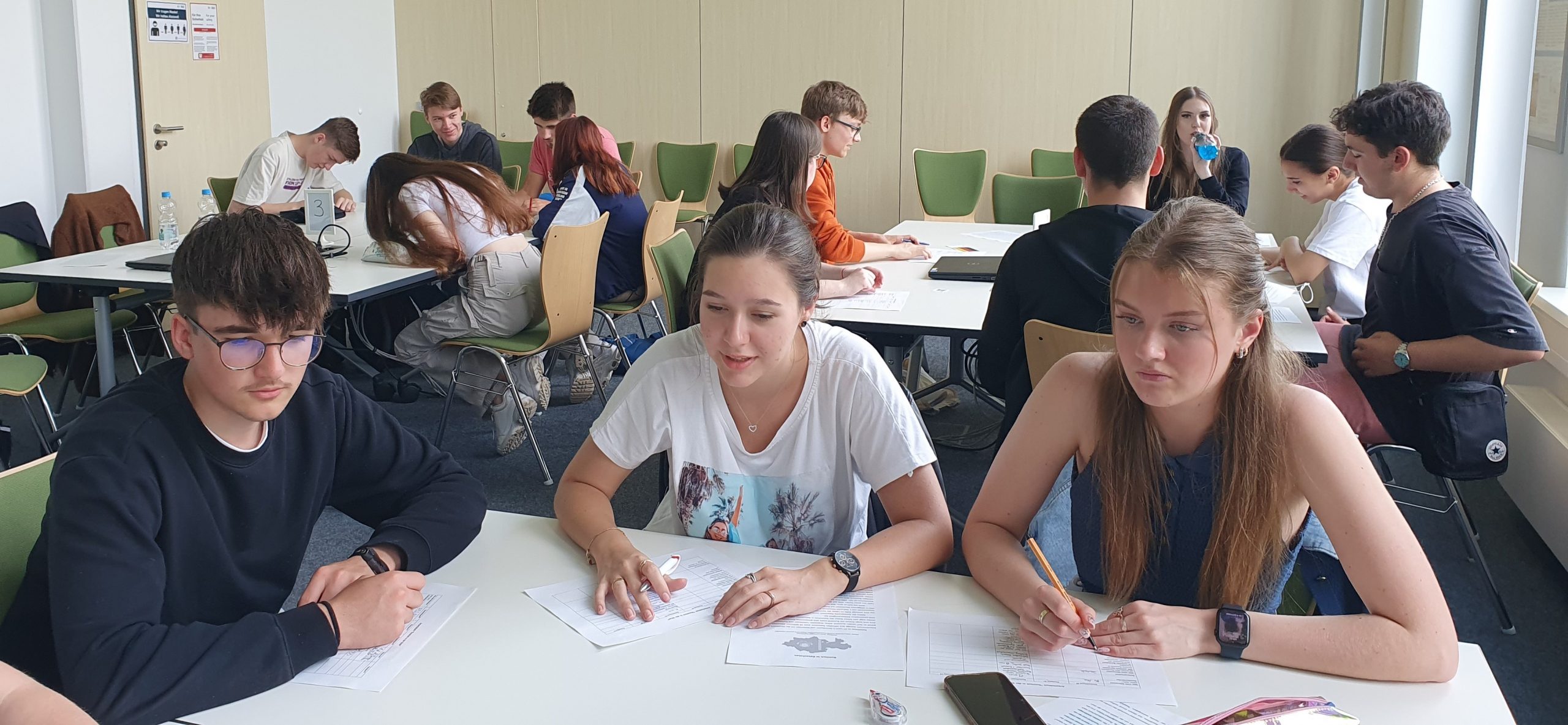 Dort wurden die Schülerinnen und Schüler von sympathischen Studierenden empfangen und lernten das Programm des Tages kennen: Zunächst gaben die Kursteilnehmer über das Programm „Mentimeter“ an, in welchen Ländern außerhalb Russlands Russisch gesprochen wird, wobei sie u.a. auf Länder wie Moldawien oder Finnland hinwiesen. Anschließend gestalteten sie mit weiteren Informationen eine Welt- und eine Europakarte, die zeigte, wo überall russischsprachige Communitys existieren. Sie staunten darüber, dass recht viele Menschen auch in Ländern wie Israel, Lettland oder Kanada Russisch sprechen, und überlegten, welche Gründe es dafür geben könnte. Dann erarbeiteten sie in Gruppen Aufsätze über die Rolle der russischen Sprache in mehreren Ländern, z.B. Kasachstan oder Litauen, und erklärten einander in Expertengruppen, in welchen Bereichen Russisch in diesen Ländern verwendet und warum dort Russisch gesprochen und gelernt wird.