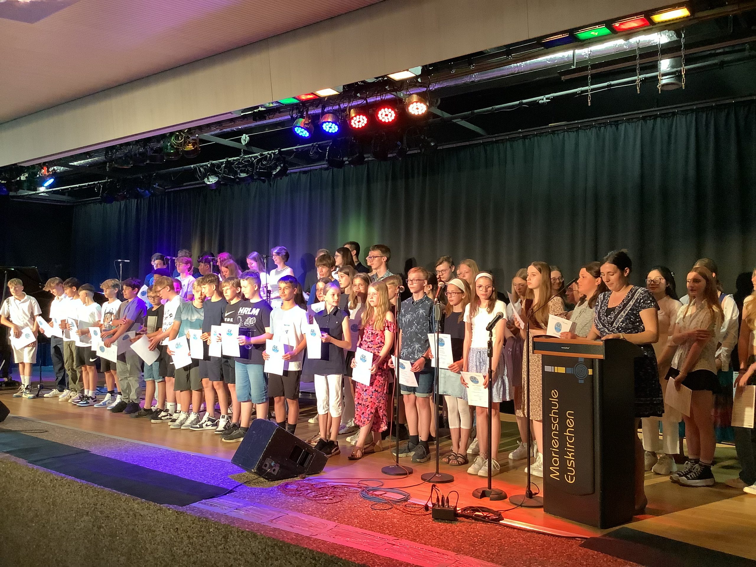 Am 19.6. fand, wie gewohnt in der letzten Schulwoche die Veranstaltung „MS ausgezeichnet“ statt, bei der Schülerinnen und Schüler geehrt wurden, die sich in diesem Schuljahr in besonderem Maße engagiert hatten. In diesem Jahr wurden das erste Mal auch Schülerinnen der Jahrgangsstufen 5 bis 7 in diesem Rahmen geehrt, so dass an diesem Abend die gesamte Jahrgangsstufenbreite mit insgesamt 105 Schülerinnen und Schülern vertreten war.