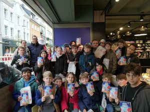 Teilgenommen hat auch unsere Klasse 5a, die das Kinderbuch im Rahmen der Unterrichtsreihe „Ist das Literatur? – literarische Texte und Kommunikation kennenlernen“ im Deutschunterricht bei Frau Adam lesen wird. Gut gelaunt ist die gesamte Klasse am 22.04.2024 nach der Mittagspause zu der Euskirchener Buchhandlung Thalia aufgebrochen. Dort hat eine thematisch passende Rallye durch die Buchhandlung auf die Klasse gewartet, um die Schülerinnen und Schüler inhaltlich auf den Roman einzustimmen. Nachdem alle das Lösungswort gefunden hatten, haben wir das Aktionsbuch und ein kleines zusätzliches Geschenk erhalten und freuen uns nun auf die Lektüre.