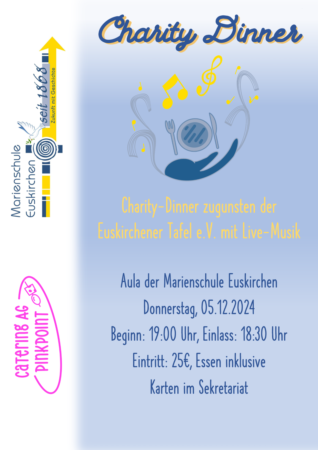 Die Marienschule Euskirchen lädt herzlich zu einem besonderen Charity-Dinner ein! Genießen Sie einen Abend voller kulinarischer Genüsse und Live-Musik in der festlich geschmückten Aula unserer Schule.
