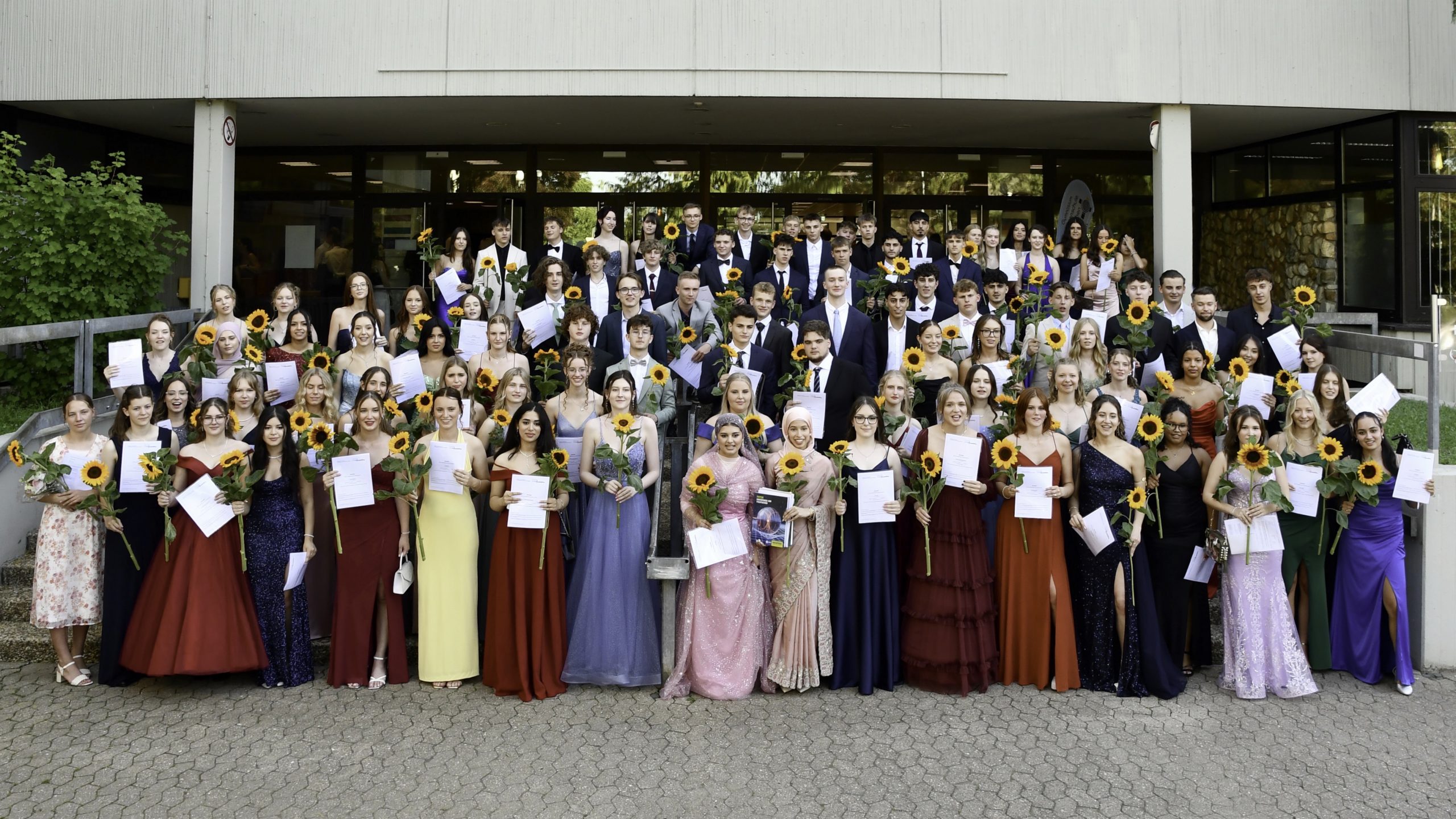 Bei gewohnt knackig heißen Temperaturen wurden zunächst in der Aula der Marienschule feierlich die Abiturzeugnisse verliehen. Stolz versammelten sich die Abiturientinnen und Abiturienten anschließend ein letztes Mal auf der Bühne und reckten den traditionellen Abschiedsgruß der MSE in die Höhe: Denn genau wie bei ihrer Einschulung vor acht Jahren bekamen sie auch jetzt eine Sonnenblume überreicht.