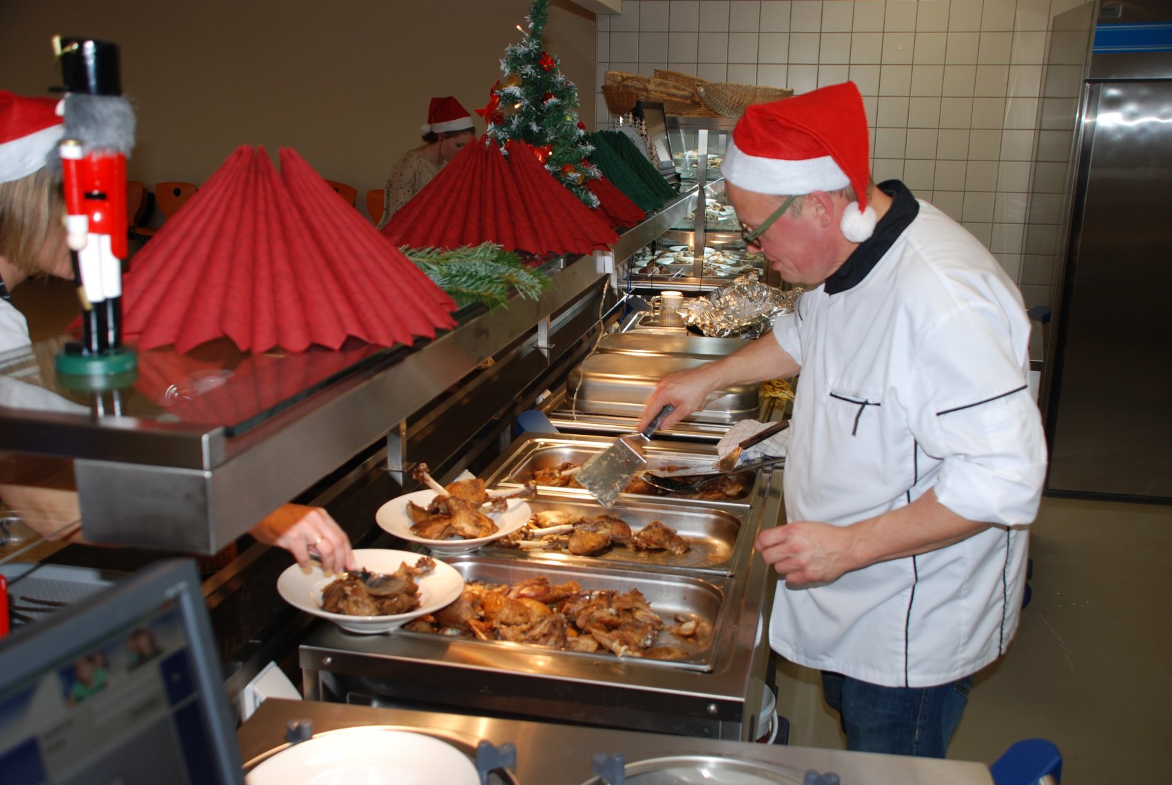 Der Arbeitstag hatte an diesem Tag für Herrn Tögel früh begonnen. Bereits um 4.30 Uhr stand er in der Küche um das Essen vorzubereiten. 26 Gänse und 12 Enten, 1500 Klöße, 40 kg Rotkraut und 140 Bratäpfel wurden frisch zubereitet. Eine wirklich logistische Meisterleistung war es, diese große Anzahl von Essen auch punktgenau fertig servieren zu können. Am Tag zuvor war bereits die Mensa dekoriert und eingedeckt worden und Herr Dreifke, der Schulverwaltungsassistent der Schule, hatte einen Ablaufplan erstellt, nach dem die jungen Gäste Platz nehmen konnten. Die Grundidee des Sternekochs Tögel wurde voll bestätigt: die Schülerinnen und Schüler wurden am Tisch bedient und genossen in weihnachtlichem Flair gemeinsam das Essen.