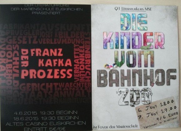 Dabei stehen mit „Die Kinder vom Bahnhof Zoo“ und „Der Proceß“ zwei vielversprechende Theaterprojekte vor ihrer Premiere. Während die damals noch minderjährige Christiane F. Ende der 1970er Jahre die Öffentlichkeit mit ihrem autobiografischen Bericht über Berliner Jugendliche schockierte, die wie selbstverständlich Drogen konsumieren, visionierte bereits sechzig Jahre früher Franz Kafka die Strukturen einer zutiefst bürokratisch strukturierten Welt, in der der Mensch um seine Selbstbehauptung und Selbstverwirklichung kämpfen muss. So unterschiedlich die beiden literarischen Vorlagen, so groß dann doch die Gemeinsamkeiten beider Projekte: In beiden Fällen haben die Schülerinnen und Schüler jeweils einen bekannten Prosatext in ein spielbares Theaterstück umgewandelt, und in beiden Fällen erfordert zudem die Sanierung des Schulgebäudes Neuerungen und Improvisation. Denn da die altbekannte Bühne in der Schulaula nicht zur Verfügung steht, werden „Die Kinder vom Bahnhof Zoo“ am sechsten Juni 2015 im Foyer der Marienschule ihre Premiere feiern; die Bühnenversion von Franz Kafkas Roman „Der Proceß“ erwartet bereits am vierten Juni im Alten Casino in der Euskirchener Innenstadt ihre Zuschauer. Beide Ortswechsel werden den Stücken in diesem Jahr mit Sicherheit eine ganz besondere Atmosphäre verleihen, auf die man sich gespannt freuen darf. Karten gibt es zum Preis von jeweils 5 Euro (Schüler/Ermäßigt) und 6 Euro (Erwachsene) bereits ab jetzt im Sekretariat der Marienschule sowie an der Abendkasse zu erwerben.