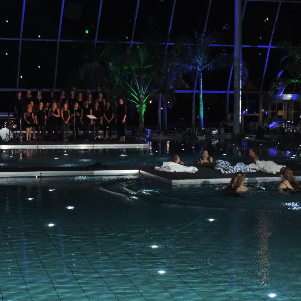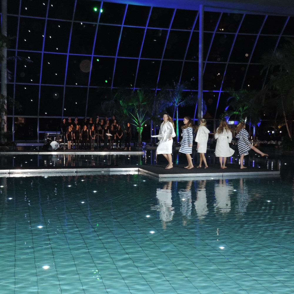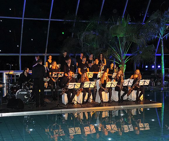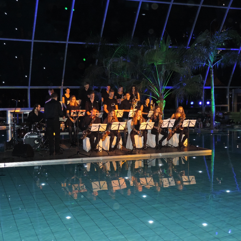Was lange Zeit als das bestgehütete Geheimnis in Euskirchen galt, war den Musikern und Sängerinnen der Big Band und des Chores schon seit langem bekannt, denn sie probten bereits seit einigen Wochen für diesen Abend. Die musikalische Umrahmung der Gala-Veranstaltung zur Eröffnung des neuen Padeparadieses am 17.12.2015 sollte auf Wunsch des Investors, Herrn Wund, mit heimischen Ensembles bestritten werden. Dass dabei die Wahl auf die Ensembles der Marienschule fiel, freute insbesondere Barbara und Michael Luke sowie Jan-Philipp Röser, die Leiter von Chor und Big Band, und v.a. natürlich die 50 Sängerinnen und Big Band-Musiker/innen. Zeichnet diese Anfrage doch ein weiteres Mal das hohe Niveau der musikalischen Arbeit an der Marienschule aus.