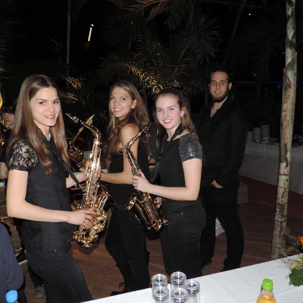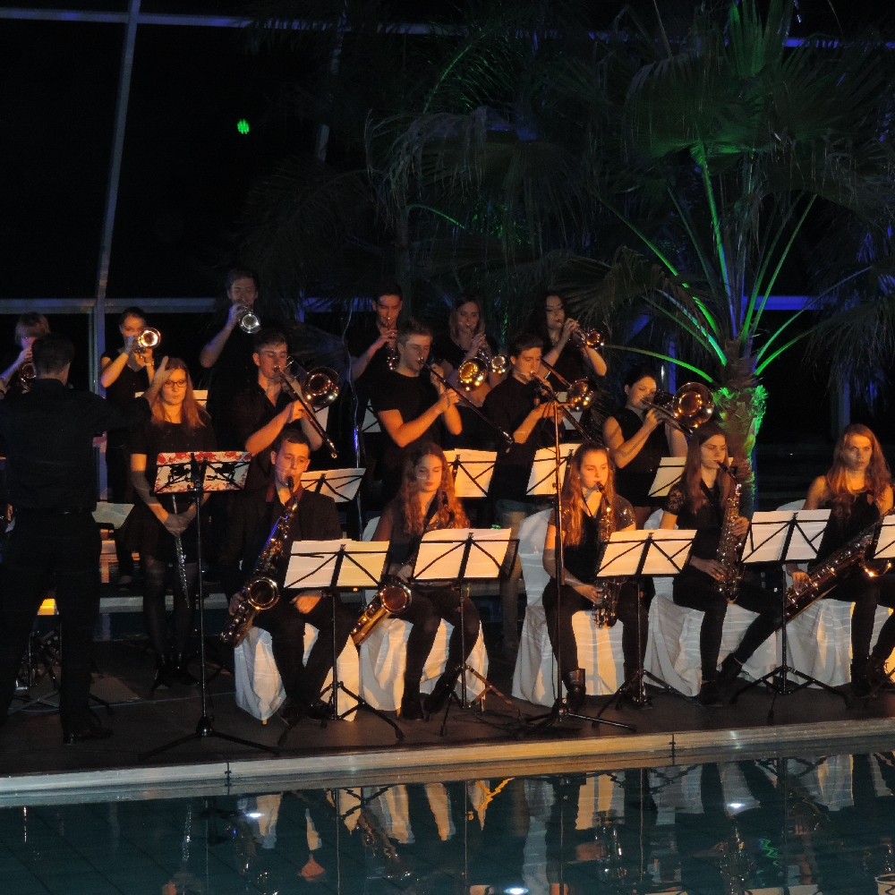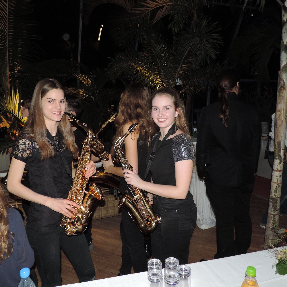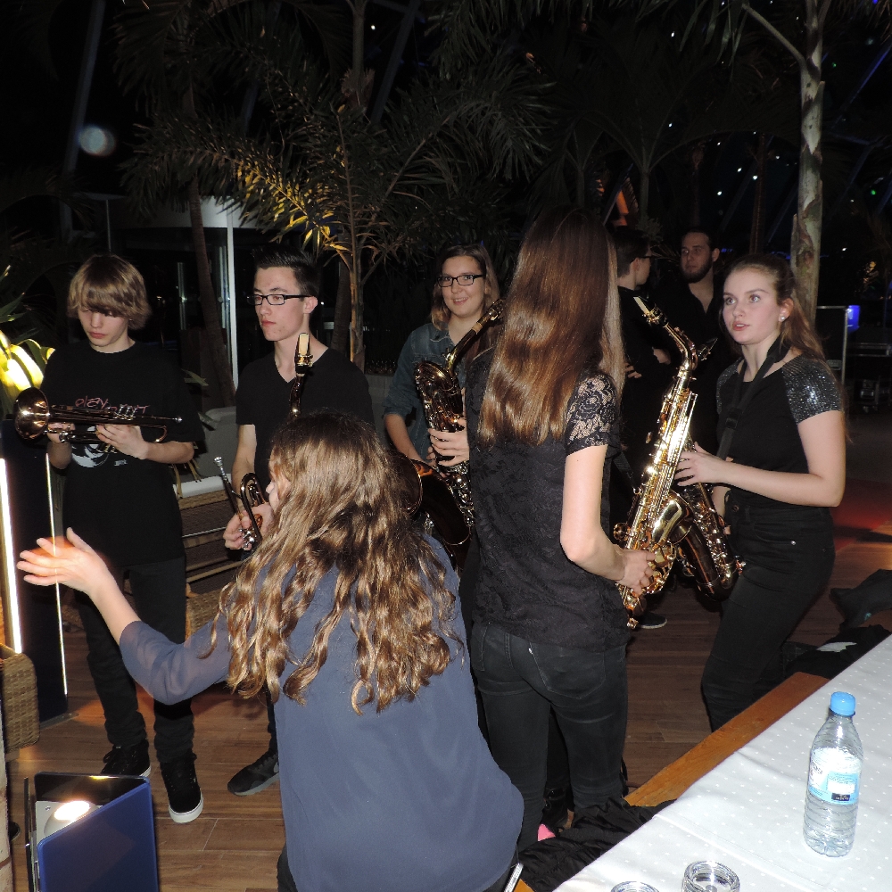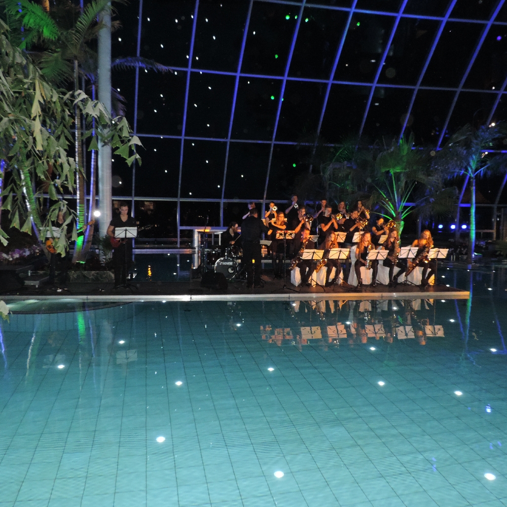 Mit Einbruch der Dunkelheit hatte sich die Palmen-Lagune noch einmal völlig verändert. Dutzende Scheinwerfer aus allen Richtungen spiegelten sich sowohl auf der Wasseroberfläche als auch unter dem Glasdach der Halle. Als die Maryphonix dann den Abend mit dem prägnanten Riff von „Smoke on the water” musikalisch eröffnete und der Big Band-Sound die riesige Halle füllte, war nicht nur bei den Musikern und Musikerinnen, sondern auch bei zahlreichen Gäste Gänsehaut-Stimmung zu spüren.