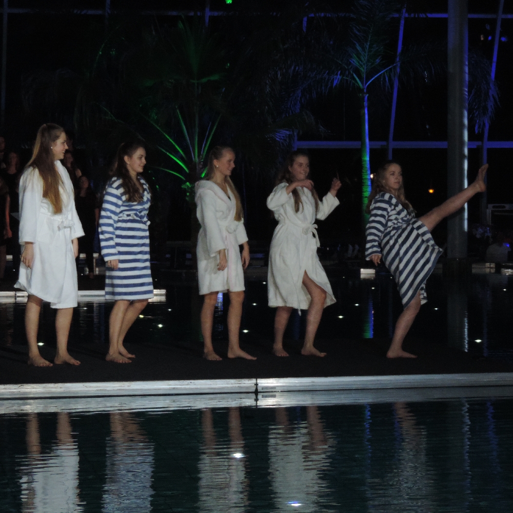 Der Chor schloss sich mit dem 20er-Jahre Schlager „Ich hab das Fräulein Helen baden sehn” an. Auf einer kleineren, ebenfalls auf dem Wasser schwebenden Bühne tanzten fünf Schülerinnen, darunter Theresa Dorn und Sarah Wagner, alle mit langjähriger Ballettausbildung, eine auf das Lied perfekt abgestimmte Choreographie, die mit einem Sprung der Mädchen ins Wasser endete und für große Begeisterung bei den Gästen sorgte.