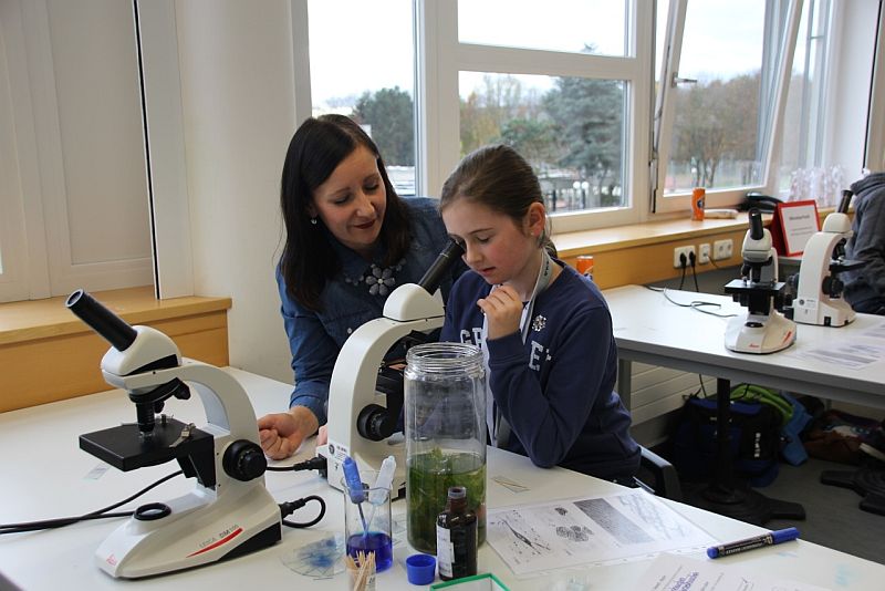 Diese Begeisterung ist es auch, die Claudia Bongard besonders positiv aufgefallen ist. Während ihre Tochter Mia interessiert durch eine Mikroskop im Biologieraum blickt, nutzt sie die Gelegenheit für ein Gespräch mit den bereitstehenden Lehrern. „Hier sind überall Ansprechpartner, Lehrer und Schüler gehen auf die Besucher zu und beantworten Fragen“, sagt sie. „Wir haben uns jetzt schon mehrere Schulen angesehen, aber hier sind wirklich alle sehr offen, das finde ich klasse!“