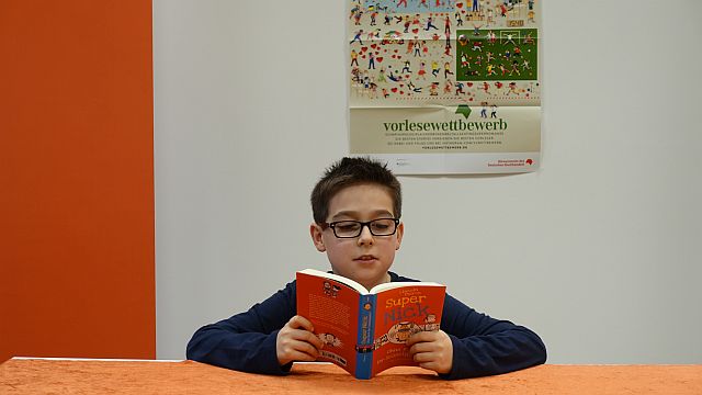 Gleich als Erster musste David im Seminarraum der Stadtbibliothek Euskirchen vor der Jury, den anderen Sechstklässlern und weiteren Zuhörern vorlesen, wobei ihm sein Freund Alexander und seine Klassenlehrerin ganz fest die Daumen drückten. Davids anfängliche Nervosität legte sich, sobald er seinen Jugendroman „Super Nick“ von Lincoln Peirce aufschlug. Lesetechnisch brillant und in pfiffig-kurzweiliger Manier trug er die witzige Episode „Operation Schnappschuss“ vor. Besonders punkten konnte er beim rundum souveränen Vorlesen eines nicht vorbereiteten Textauszugs aus dem Kinderbuch „Paul Vier“ von Andreas Steinhöfel.