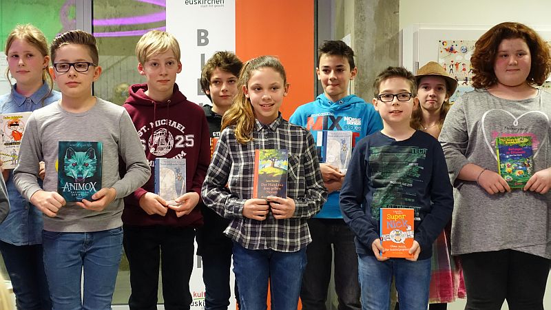 Im Anschluss an die Vorleserunden gab es für alle vierzehn Schulsieger eine Urkunde und ein Buchgeschenk des Börsenvereins, außerdem einen Selfie-Stick sowie eine große, bunte Spardose mit einer Tasse, gestiftet von der Kreissparkasse Euskirchen.
