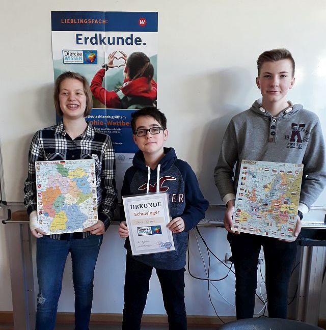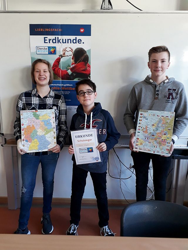 Schulsieger der Marienschule wurde David C. (8d) vor Anna-Lena R. (EF) und Leon D. (EF). Alle drei sind bilinguale Erdkundeschüler, die damit bewiesen haben, dass sie in beiden Sprachen geographisch fit sind. David tritt nun als Schulsieger gegen die anderen Schulsieger NRWs an. Wir wünschen ihm viel Erfolg!