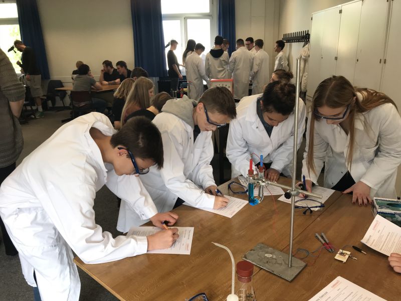 Elektrizität war das Überthema, das in folgende fünf Unterthemen aufgeteilt wurde: Reibung, Elektrolyse, Magnetismus, Druck und die Galvanische Zelle. An jeder Station hielten die Auszubildenden zunächst eine kurze Einleitung, anschließend folgte ein praktischer Teil, in dem die Schüler ihr Können anhand von verschiedenen Experimenten zeigen konnten. Am Ende jeder Station bekam jeder Schüler ein Handout, auf dem teilweise Fragen beantwortet werden mussten.