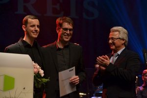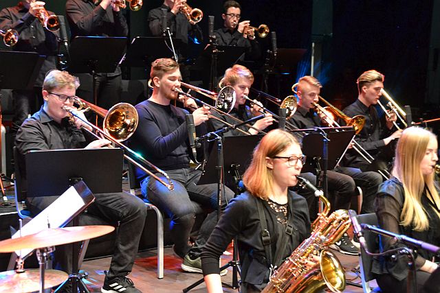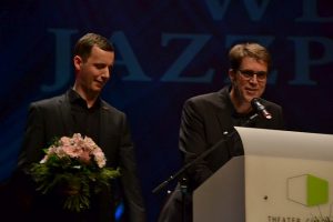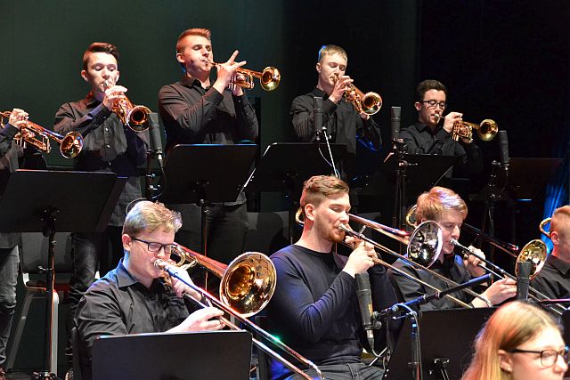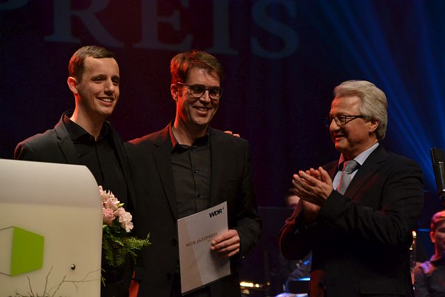Lange Zeit schien die Vorfreude auf die Auszeichnung jegliche Nervosität zu verdrängen, doch dies sollte sich kurz vor dem Betreten der Bühne ändern. „Die letzten Minuten vor dem Auftritt sind die schlimmsten“, scherzte Jan Philipp Röser. „Wenn man nichts mehr tun kann, sondern nur noch wartet, bis der Vorhang sich öffnet. Doch das ist eine sehr positive Anspannung.“ Immer näher rückte der Moment und schließlich ergriffen die Moderatoren Dr. Götz Alsmann und Prof. Karl Karsen, Sendechef des WDR, das Wort. „Wir verleihen nun zum 15. Mal unseren WDR 3 Jazzpreis und erneut werden uns heute herausragende Musiker in unserer Entscheidung bestätigen“, kündigte Karl Karsen den Auftritt der Maryphonix Bigband an, die stellvertretend für insgesamt 150 Schülerinnen und Schüler aller vier Bigbands und der drei Musikklassen den Preis entgegennahmen. „Viele Schulen in Nordrhein-Westfalen verfügen über eine Bigband, doch nur die Marienschule in Euskirchen kann ganze vier Bigbands vorweisen.“ Absolute Stille breitete sich bei den rund 500 Besuchern im Theater Gütersloh aus und alle erwarteten die ersten Klänge des 20-köpfigen Ensembles. Mit Titeln wie „Spirit“ von Al Jarreau und „Little Sunflower“ von Freddie Hubbard sollten sie alle Erwartungen sogar noch übertreffen und begeisterter Applaus folgte auf jede ihrer Vorführungen. „Anhand dieses Auftrittes und der Begeisterung aller beteiligten Schülerinnen und Schüler der Marienschule Euskirchen kann man erkennen, dass wir uns auch in Zukunft keine Sorgen um den Nachwuchs in der Jazzmusik machen müssen“, schwärmte Karl Karsen an die jungen Musiker gewandt. „Ich bin überzeugt davon, dass wir schon bald mehr von euch auf unserem Sender hören werden. Also bleibt dran und ihr werdet es mit der Musik weit bringen.“