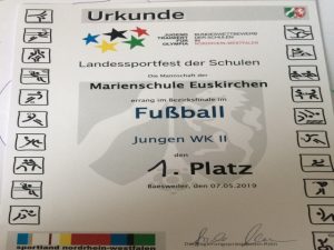 Nachdem die Mannschaft bereits auf Kreisebene und in der Bezirkshauptrunde ohne Niederlage vom Feld gegangen war, konnte die Mannschaft auch im Bezirksfinale niemand stoppen. Auf dem schwer zu bespielenden Rasen in Baesweiler trat die Elf zunächst gegen die Heimmannschaft an und konnte sich dort souverän mit zwei zu null durchsetzen, bevor im darauffolgenden Spiel die vielleicht stärkste Mannschaft (Käthe Kollwitz Gesamtschule Leverkusen) auf die Marienschüler wartete. Doch auch in diesem Spiel trat die Mannschaft wahnsinnig geschlossen auf und ließ kaum Chancen des Gegners zu. Einen der immer schnell vorgetragenen Konter konnte Leverkusen im Strafraum lediglich per Foul an Joel Plambeck stoppen, so dass in einem engen Spiel ein Elfmeter von Robin Berk den Grundstein zum Einzug ins Landesfinale legte. Nachdem die anderen Mannschaften sich gegenseitig die Punkte abnahmen, spielte die Marienschule abschließend gegen das Anno-Gymnasium aus Siegburg in einem letztlich unbedeutenden Spiel 1:1 durch ein Tor von Simon Uhlenbroch.