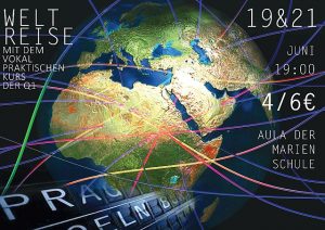 Am Mittwoch- und Freitagabend, dem 19. und 21. Juni, lädt der Vokalpraktische Kurs der Q1 zum Konzert „Weltreise“ in die Aula der Marienschule ein. Sowohl mit bekannten Stücken wie „Africa“ von Toto und der „Bohemian Rhapsody“ von Queen, als aber auch selten zu hörenden landestypischen Liedern, führt der Chor die Zuhörer*innen, auf seiner Reise über Großbritannien, Brasilien, Afrika bis nach Korea und wieder zurück in die Heimat. Begleitet wird er von einer vierköpfigen Band von Musikern der Blue Mary Bigband.