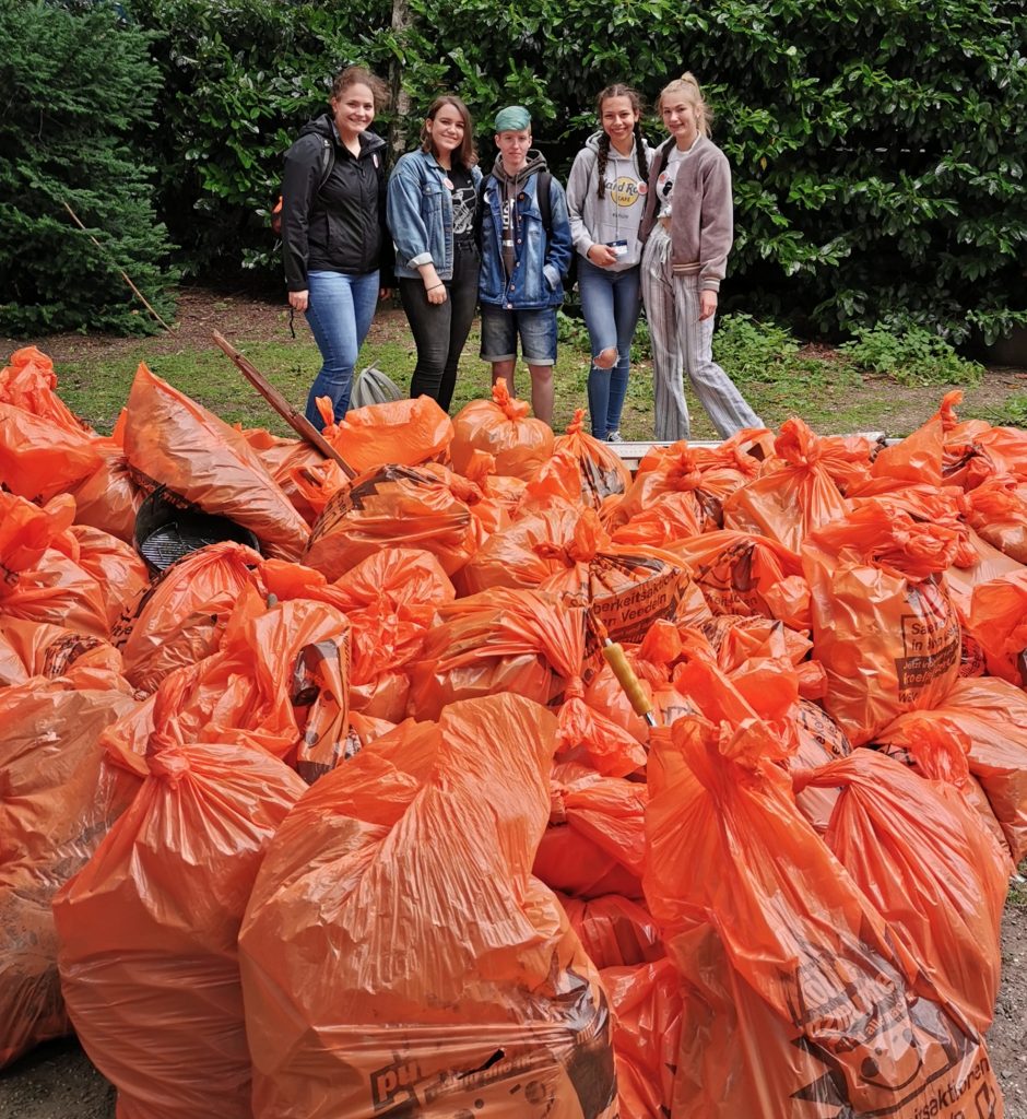 Anlässlich des „World Oceans Day“ wollte der Kölner Zoo mit der Aktion „Kölner Zoo putzmunter“ auf die Verschmutzung der Meere und Flüsse aufmerksam machen. Viele freiwillige Helfer, darunter auch die vier Marienschüler*innen Jennifer Besrotni, Luca Nettesheim, Emily Schiemann und Ariane Tajerle des EF-Sozialwissenschaften-Kurses von Frau Biendarra, halfen über zwei Stunden, die Rheinwiesen vom Müll zu befreien. Dabei kamen säckeweisen Müll zusammen – von Plastikmüll in allen Formen und Farben, über Leitern, Grills, Säcken voll Kleidung bis hin zu Computerbildschirmen – Es gab wohl nichts, was es nicht gab!