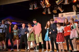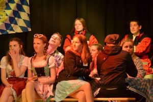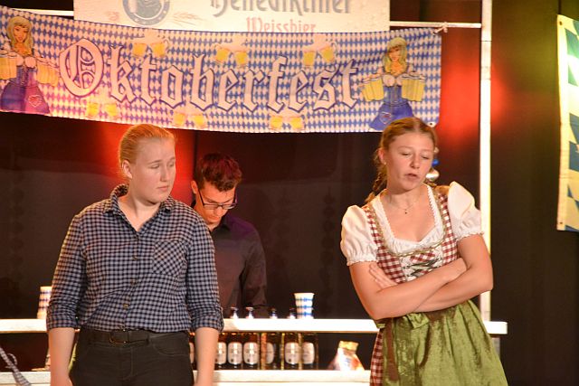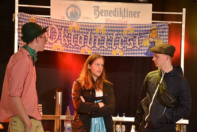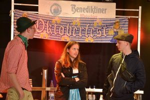 „In dem Stück treffen Sanitäter, Wirtschaftsmogule, Arbeitslose und alle Schichten der Gesellschaft aufeinander“, erklärte Kursleiter Manuel von Zelisch. „Das führt zu einem wunderbaren Durcheinander, bei dem jeder nur auf seinen eigenen Vorteil bedacht ist.“ Ursprünglich in der Zeit der Weltwirtschaftskrise angesiedelt, hatten die Schüler der Marienschule das Stück um einige moderne Details erweitert. So trieben am Donnerstag und Freitag auch zwei aufstrebende YouTube-Sternchen ihr Unwesen auf dem Oktoberfest. Mit Ausnahme einiger in der heutigen Zeit kaum mehr gebräuchlichen Redewendungen, zeigte sich das Stück generell thematisch nach wie vor hochaktuell. „Das Stück ist gesellschaftskritisch und beleuchtet, wie sehr sich arm und reich immer weiter voneinander entfernen“, so von Zelisch. Da war es kaum verwunderlich, dass die Gespräche oftmals für beide Beteiligten sehr verwirrend ausfielen, da sich niemand in die Gedankenwelt des anderen hineinversetzen konnte. Chaotisch und humorvoll beleuchteten die Schülerinnen und Schüler die gesellschaftliche Kluft zwischen den Oktoberfestbesuchern. Dabei machten sie jedoch immer wieder deutlich, dass unabhängig ihres Einkommens hinter jedem Namen und Titel nur ein Mensch steckt.
