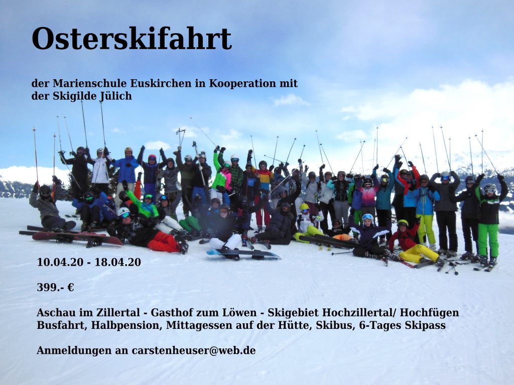 In den kommenden Osterferien wird die Marienschule Euskirchen in Zusammenarbeit mit der Skigilde Jülich wieder eine Skifahrt in den Osterferien anbieten können. Im kommenden Jahr werden wir abermals ins Zillertal fahren. Das Skigebiet ist eines der Top-Skigebiete Österreichs mit über 155 km Piste bis auf 2500m.