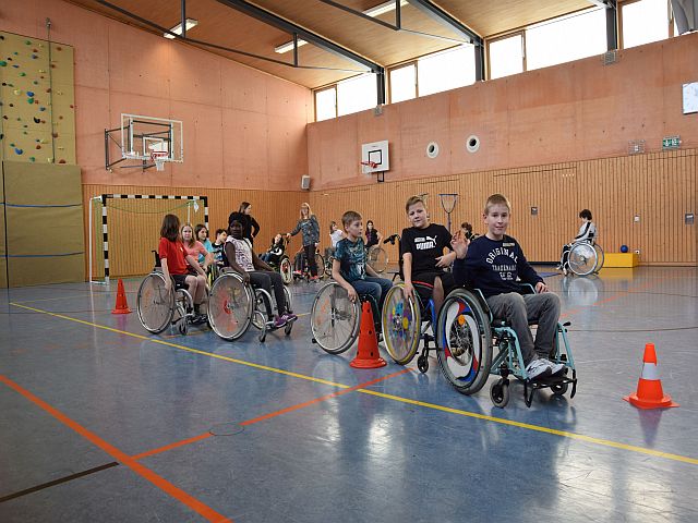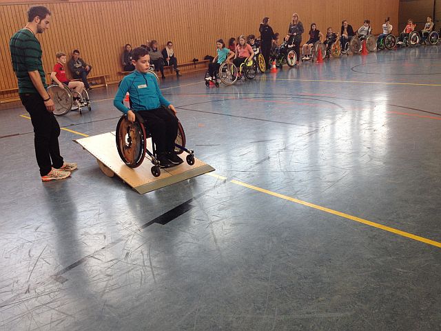 Am 16.03.2016 hat die Klasse 5c im Rahmen des Sportunterrichts von Herrn Kaspers einen Ausflug zur Irena-Sendler-Schule in Euenheim gemacht. Als wir nach einem 20-minütigen Fußweg dann endlich in der Schule waren, hat uns Frau Schmitz, eine Lehrerin der Irena-Sendler-Schule, die vier Stunden pro Woche in unserer Klasse ist, Namensschilder verteilt. Danach sind wir in eine kleine Turnhalle gegangen und haben unsere „Lehrerin für einen Tag“, Frau Ziegler, kennengelernt. Sie hat uns drei verschiedene Rollstuhlarten erklärt. Es gibt normale Rollstühle, Sport-Rollstühle und Handbikes. Danach hatten wir eine kleine 15 Minuten-Pause und dann ging es erst richtig los! Wir haben sieben Schüler(innen) mit einer Behinderung kennengelernt, haben uns vorgestellt, Rollis bekommen und geübt, damit zu fahren, langsam und schnell, vorwärts und rückwärts, nach links und nach rechts. Wir haben sogar einen kleinen Parcours mit einem Slalom und einer Wippe gemeistert. Nach ungefähr zehn Minuten haben wir mit den anderen, die keinen Rolli bekommen hatten, getauscht. Dann konnten wir endlich Basketball spielen. Wir wurden von unserer Lehrerin in zwei Gruppen aufgeteilt, eine rote und eine grüne. Die Mannschaften haben fünf gegen fünf gespielt und Herr Kaspers hat uns dann immer mal wieder ausgetauscht. Als wir mit dem Basketballspiel fertig waren, haben Frau Schmitz und Herr Kaspers uns fotografiert und dann mussten wir die Rollis abstellen. Die meisten waren traurig, aber auch manche glücklich, dass sie endlich die Rollis verlassen konnten. Wir mussten uns umziehen und haben noch Wasser oder Apfelsaft erhalten. Danach mussten wir leider wieder zurückgehen.