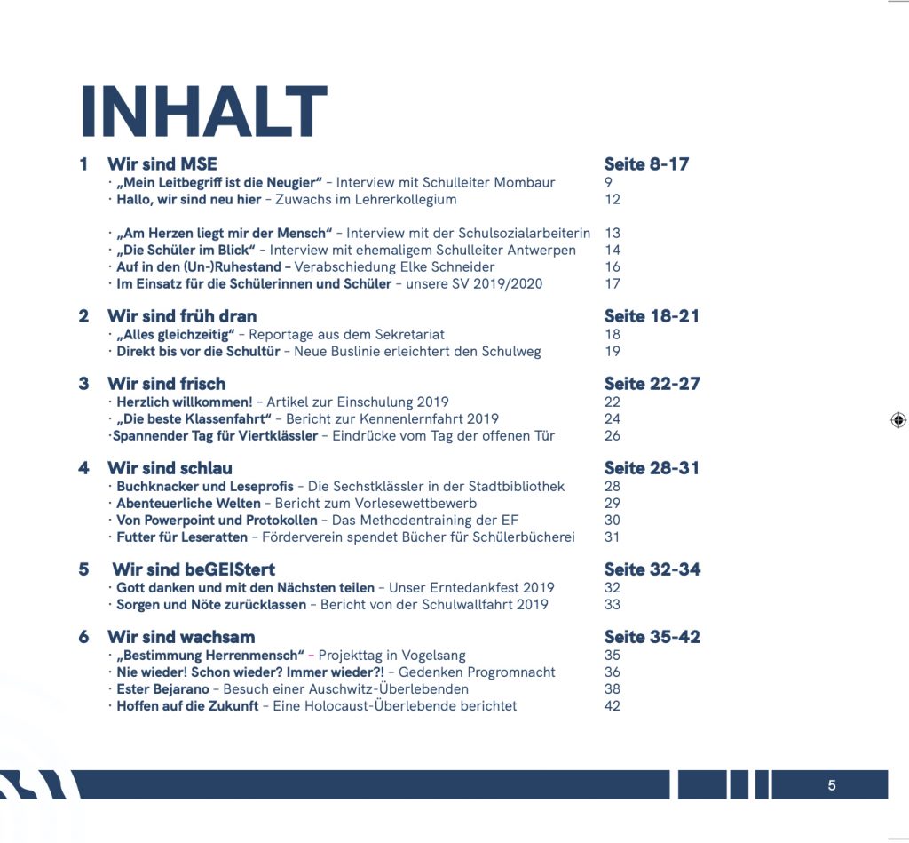 Zukünftig soll die Schulkultur der MSE bereichert werden durch eine Schulchronik, die das Wesentliche eines Schuljahres bewahrt und gleichzeitig auch durchaus neue Akzente setzen möchte; so soll nicht nur Bewährtes und Erlebtes aufgegriffen und auch vertieft werden, sondern wir wünschen uns, dass auch Unentdecktes Würdigung erfährt und mitunter leise Geschichten erzählt werden, die eben auch den Schulalltag der Marienschule ausmachen.
