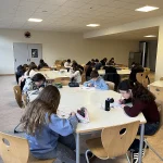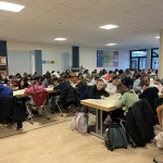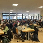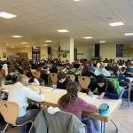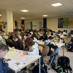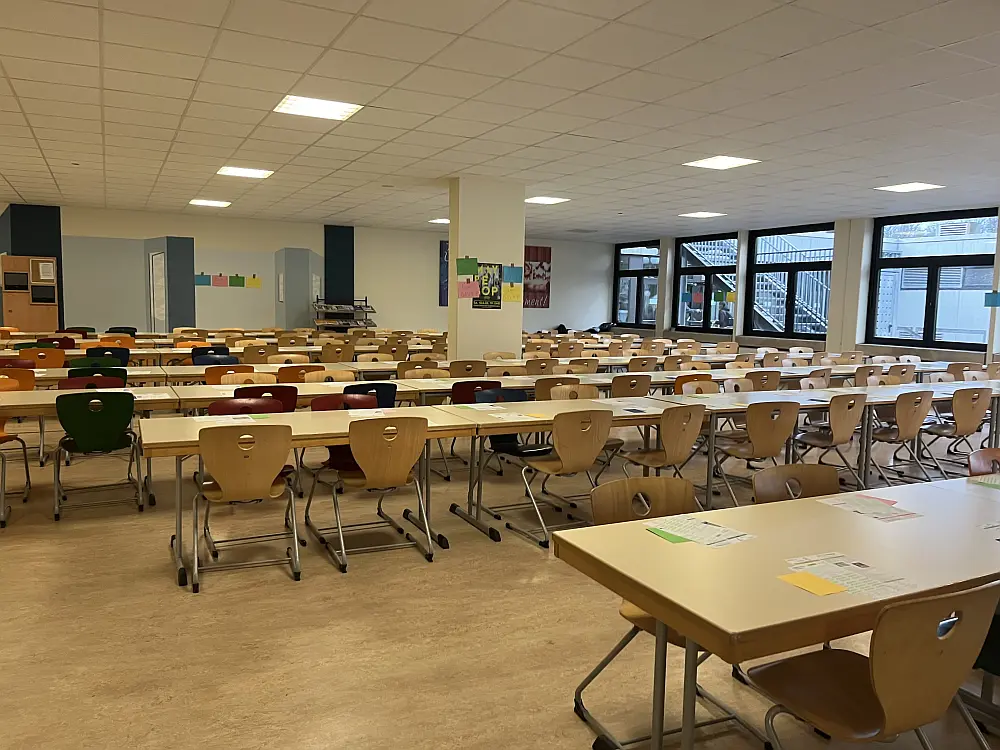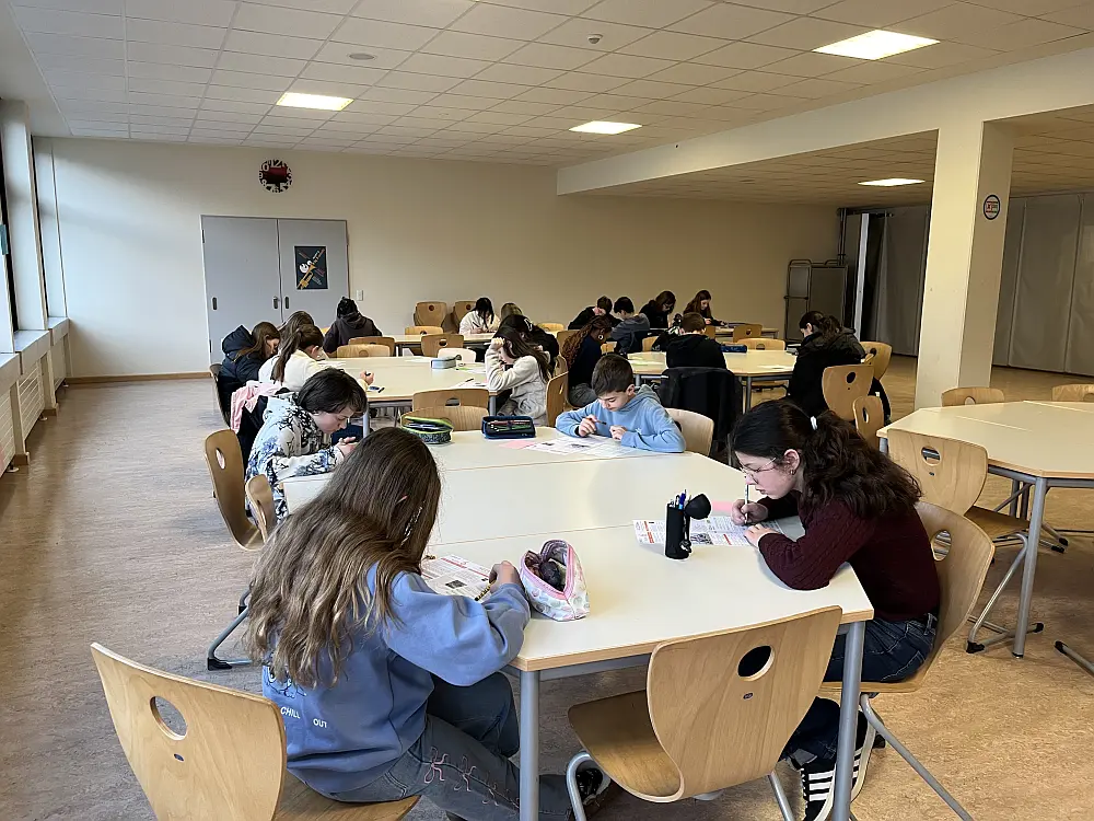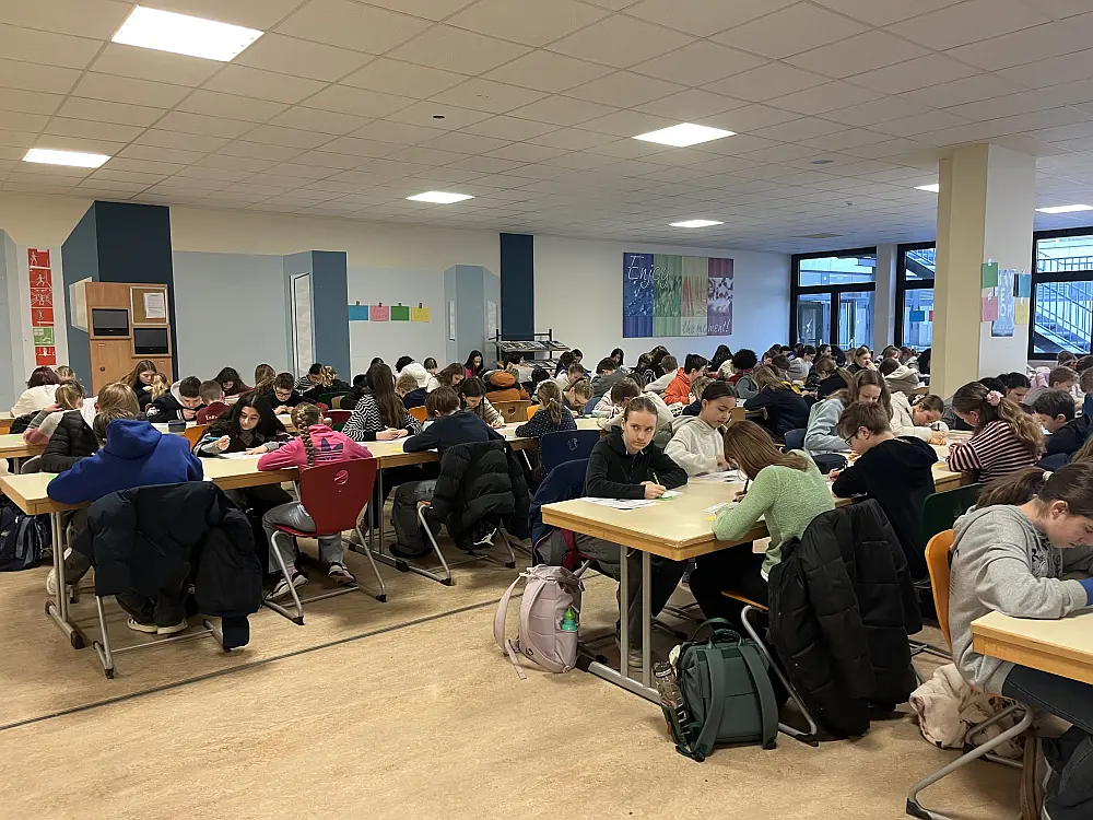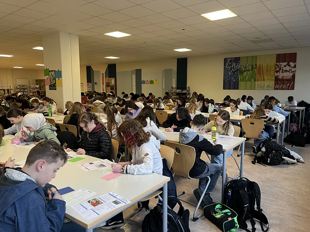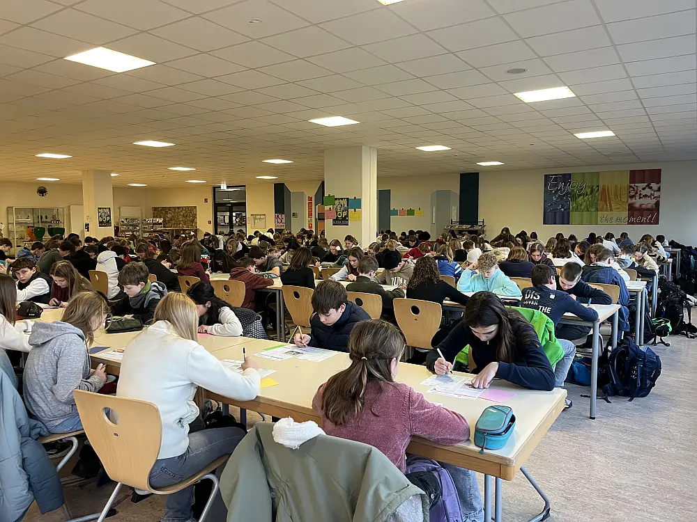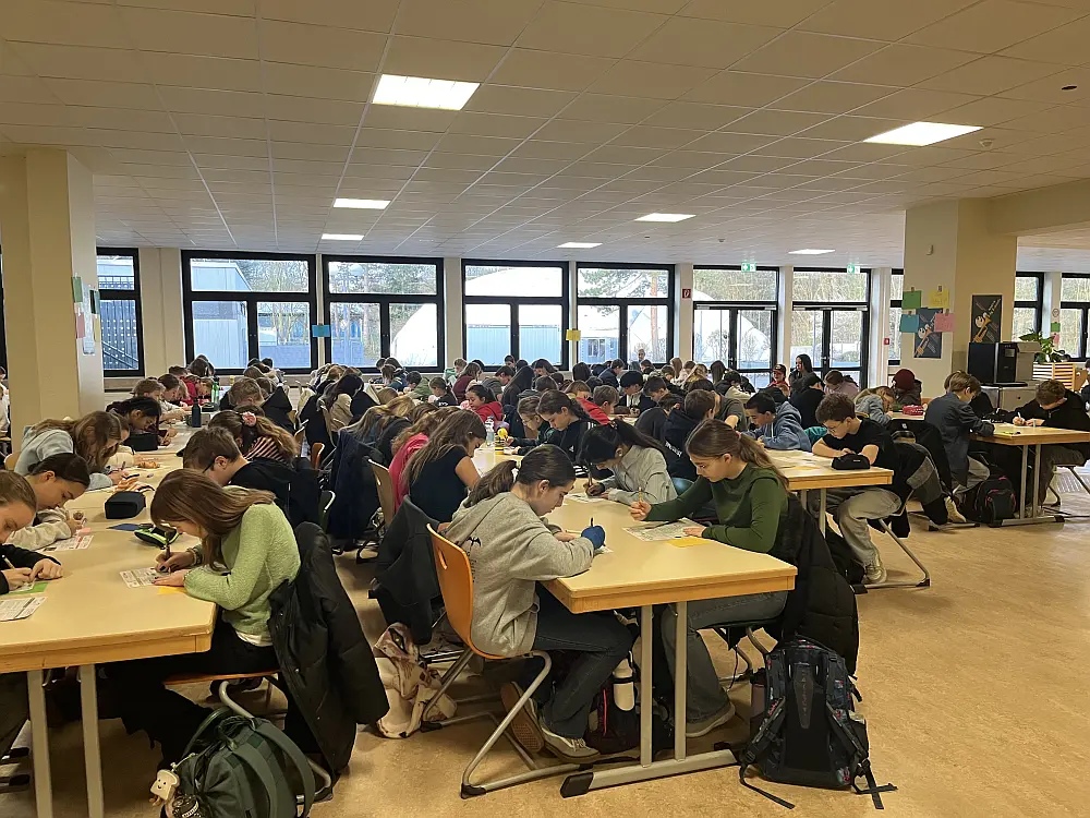 In der ersten Stunde versammelten sich die TeilnehmerInnen in der Eingangshalle, um dann geschlossen in die von den FachkollegInnen vorbereitete Mensa zu gehen. Dort lagen auf den Tischen bereits die Prüfungsfragen und auch der Antwortbogen bereit. Mit viel Freude und Neulust startete die 45-minütige Arbeitsphase, die mehr Spaß machte, als manch einer erahnt hatte.