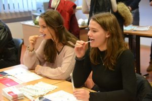 Das Thema Knochenmarkspende an Schulen anzusprechen sei für die DKMS eine sehr wichtige Angelegenheit, betonte Mitarbeiterin Maren Bauchmüller. „Junge Leute bleiben natürlich länger in der Kartei und haben somit auch länger die Möglichkeit, ein Leben zu retten.“ Sie selbst habe bereits die Erfahrung machen dürfen, einem anderen Menschen mit ihrer Spende zu helfen. Dieser Weg zum Lebensretter dauere oft nur ein paar Minuten und ist mit kaum Aufwand verbunden. „Die Abgabe einer Speichelprobe und einigen privaten Daten reichen aus, um sich in die Liste möglicher Spender einzutragen. Letztere bleiben selbstverständlich geheim und werden nicht an Dritte weitergegeben.“ Auch im Falle eines Treffers dauere die Entnahme der Spende, inklusive anschließender Unterbringung in einem Hotel nicht länger als ein, maximal zwei Tage. Umso wichtiger sei es, dass sich möglichst viele Menschen für eine Typisierung entscheiden. Wie Bauchmüller weiter erklärte, gebe es insgesamt mehr als 50 Millionen Kombinationen, die für eine passende Spende ausschlaggebend sind. „Es ist wie ein genetischer Fingerabdruck und selbst innerhalb einer Familie liegt die Chance eines Treffers gerade einmal bei eins zu drei.“