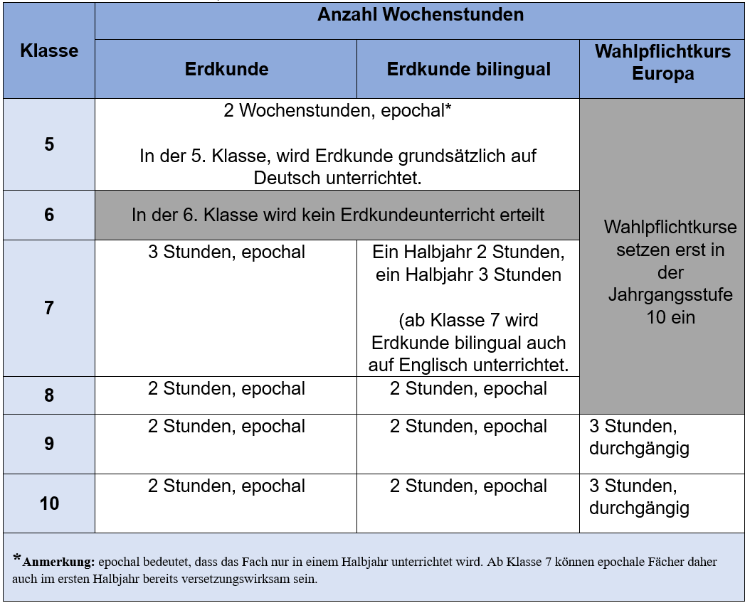 Erdkunde begleitet dich durch die gesamte Sekundarstufe I, von Klasse 5 bis zur Klasse 10 (ausgenommen ist die Klasse 6) und in der Qualifikationsphase der Sekundarstufe II. Hier hast du die Möglichkeit, Erdkunde als Leistungs- oder Grundkurs zu belegen und auch als schriftliches oder mündliches Abiturfach zu wählen.