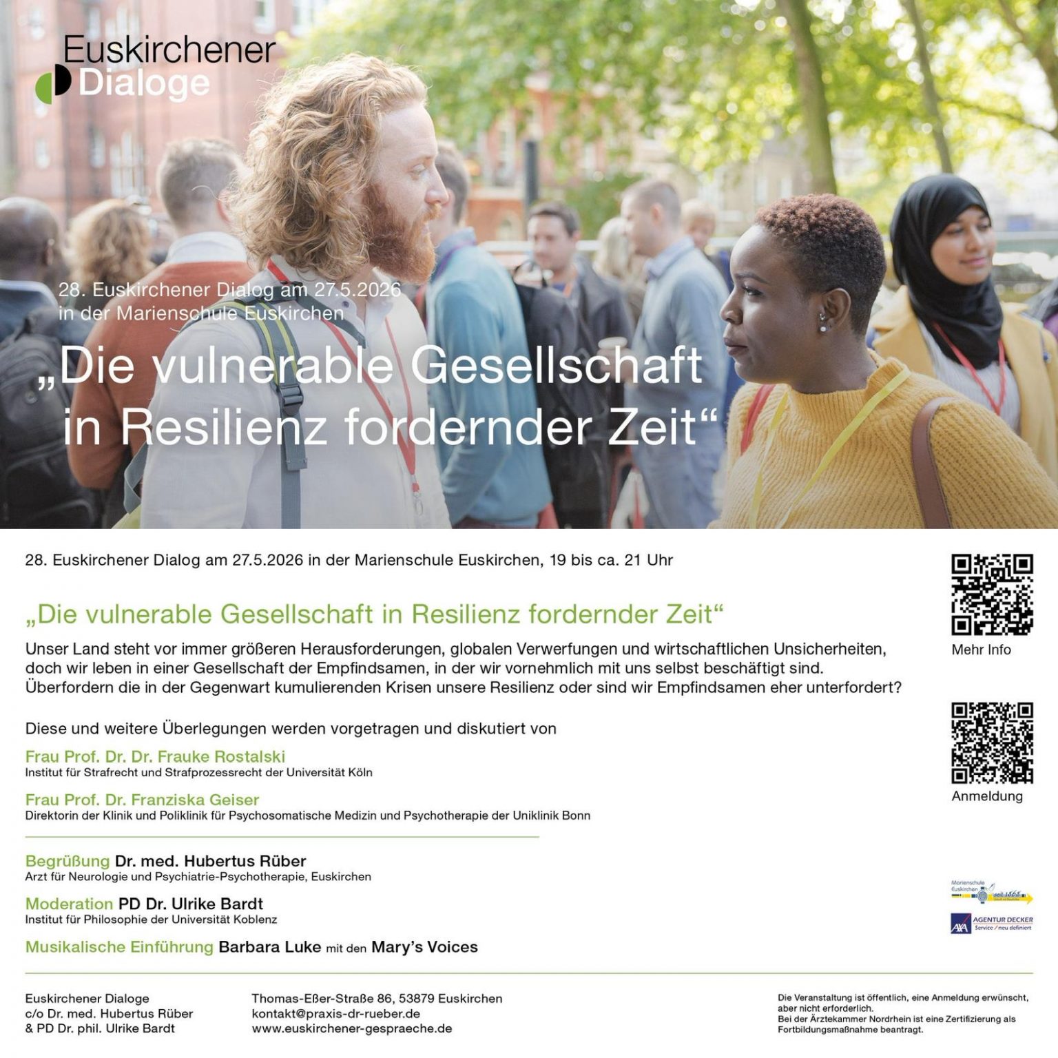 Der 28. Euskirchener Dialog lädt am 27. Mai 2026 erneut dazu ein, zentrale Fragen unserer Zeit gemeinsam zu beleuchten und kritisch zu diskutieren. Unter dem Titel „Die vulnerable Gesellschaft in Resilienz fordernder Zeit“ richtet die Veranstaltung den Blick auf die wachsenden Spannungsfelder zwischen gesellschaftlicher Empfindsamkeit, globalen Herausforderungen und der Frage, wie belastbar wir als Gemeinschaft tatsächlich sind. Renommierte Expertinnen aus Recht, Philosophie und Psychosomatik eröffnen dabei vielfältige Perspektiven auf ein Thema, das uns alle betrifft.