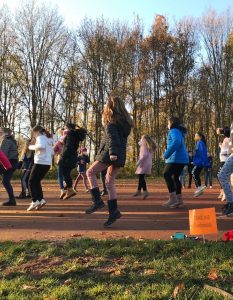 Natürlich musste ein Tanz her, der die Schülerinnen und Schüler während der Pausen zur Bewegung und zum Aufwärmen animieren kann. So war schnell ein Flashmob einstudiert, der zwei Wochen lang den Mitschülerinnen und Mitschülern auf ihren jeweiligen Pausenhöfen beigebracht wurde. Das Angebot wurde so gut angenommen, dass sich schon bald viele Schülerinnen und Schüler – natürlich mit Abstand – bewegten und tanzten. Die Schülerinnen und Schüler der Tanz-AG bedanken sich bei allen, die mitgemacht haben und freuen sich darauf, den Flashmob einmal mit allen gemeinsam zu tanzen, wenn denn dann alle Schülerinnen und Schüler wieder gemeinsam auf einen Schulhof dürfen.
