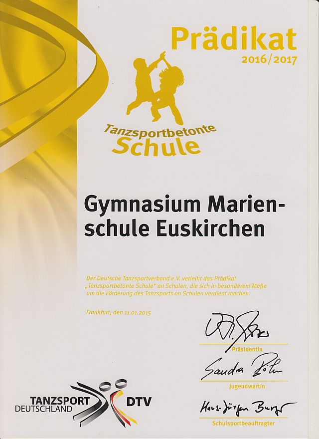P. S.: In unmittelbarer zeitlicher Nähe zu dem Ball ist wie von Zauberhand im Büro unseres neuen Schulleiters eine Urkunde des Deutschen Tanzsportverbandes e. V. aufgetaucht, der der Marienschule Euskirchen für die Jahre 2016/2017 das Prädikat „Tanzsportbetonte Schule“ verliehen hat.