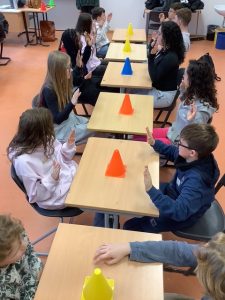 Dieses und noch viele weitere Spiele wurden an diesem Tag mit der Klasse 7d im Rahmen des Projekts ,,Wellenbrecher — ein Projekt zur Stärkung der Persönlichkeit” gespielt. Zunächst gab es eine kleine Vorstellungsrunde, in der jeder seinen Namen, sein Alter und sein Lieblingsgericht nannte. Wir durften Anne und Felix alles fragen, was wir wollten. Danach beteiligten wir uns an einem klassenübergreifenden Wettbewerb: Alle Klassen der Jahrgangsstufe 7 schrieben Namensschilder für alle in ihrer Klasse — auf Zeit. Anne und Felix berechneten dann den Durchschnitt und bestimmten den Gewinner.