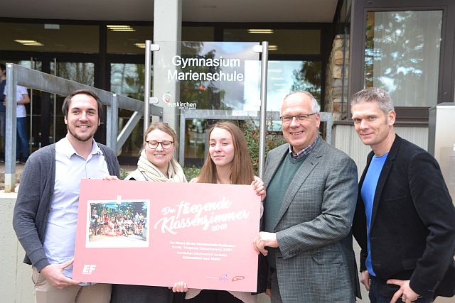 Ein Freudenschrei hallte am Donnerstagvormittag durch die Flure der Marienschule Euskirchen. Nachdem Schulleiter Jürgen Antwerpen gemeinsam mit Stellvertreter Stefan Binder den Klassenraum der 9b betrat, herrschte zunächst erwartungsvolles Schweigen. Als dann jedoch auch Tobias Dieter und Verena Schmidt von der Unternehmensgruppe „Education First“ mit einem großen Gutschein durch die Tür traten, kannte der Jubel keine Grenzen mehr.
