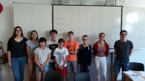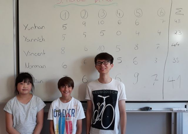 Es warteten sechs Aufgaben auf die fünf Jahrgangsstufenbesten, die dieses Jahr an der 3. Runde teilnahmen: neben Vincent, Yunhan und Julian noch Yannick F. aus der 6C und Norman G. aus der 8B. Die offenen Aufgabenformate verlangten den Schülern viel Rechenkunst, Kreativität und abstraktes Denken ab. Sie alle schlugen sich hervorragend, aber die 44 von 60 möglichen Punkte von Vincent waren für die anderen Teilnehmer unerreichbar. Dabei brachte erst die Korrektur seiner Lösung zur 6. Aufgabe die Entscheidung und es sah lange Zeit nach einem Unentschieden zwischen ihm und Yunhan aus. Herzlichen Glückwunsch, Vincent, zu deinem Sieg und den anderen Teilnehmern zu ihren tollen Ergebnissen.
