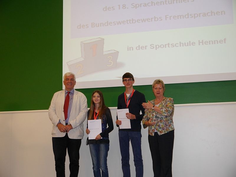 Die Preisverleihung am Samstagmorgen begann mit einem Grußwort der Wettbewerbsleitung sowie der Schulministerin NRWs, Sylvia Löhrmann. Nach einem Rückblick auf das Sprachenturnier berichteten uns zwei Teilnehmer von ihren Erfahrungen beim ISLI Seminar, das sie bereits im letzten Jahr gewonnen hatten. Bei diesem internationalen Seminar treffen Schüler/innen aus ganz Europa auf ausländische Jugendliche, die hier als Kinder von Soldaten Militärschulen besuchen, und beschäftigen sich gemeinsam mit Führungsqualitäten.
