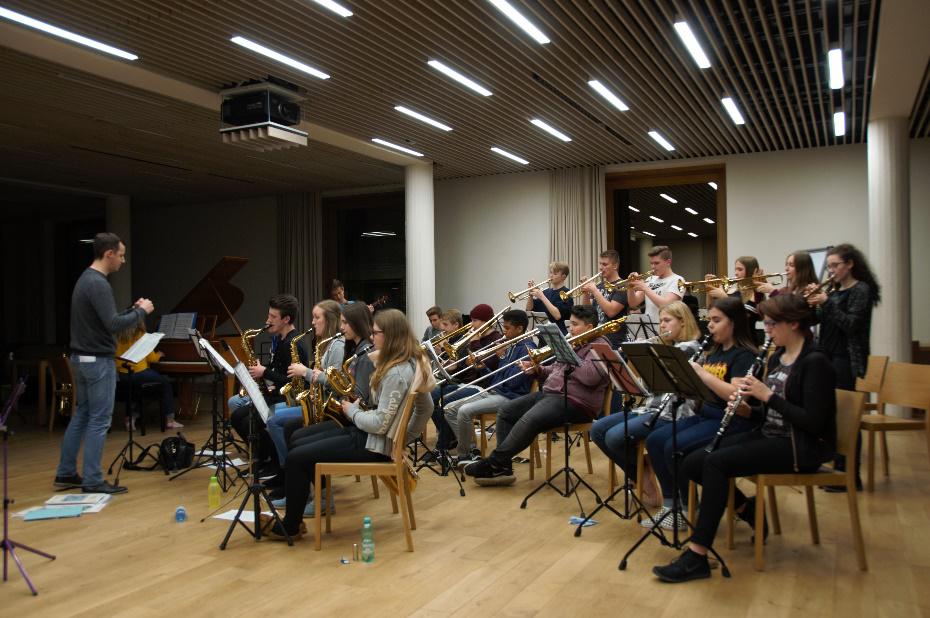 Zwei interne Kurz-Konzerte am Ende eines Probentages, in denen die Big Bands jeweils ihre Arbeitsergebnisse präsentierten, trainierten die Auftrittssituation und sorgten auch am Ende eines es noch einmal für Spannung und Konzentration.