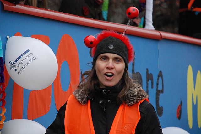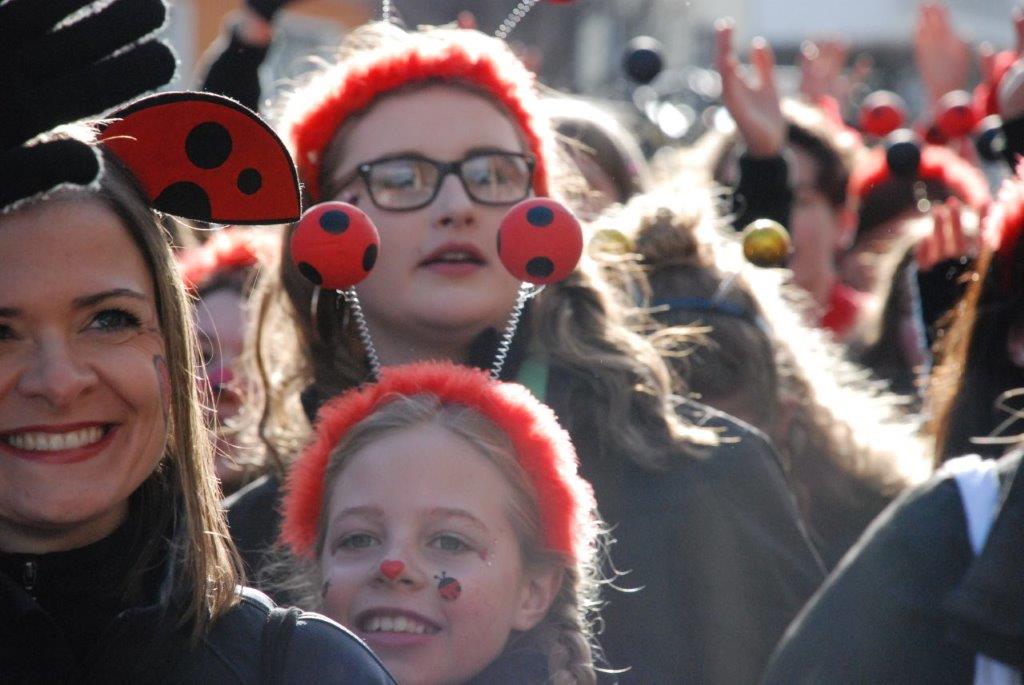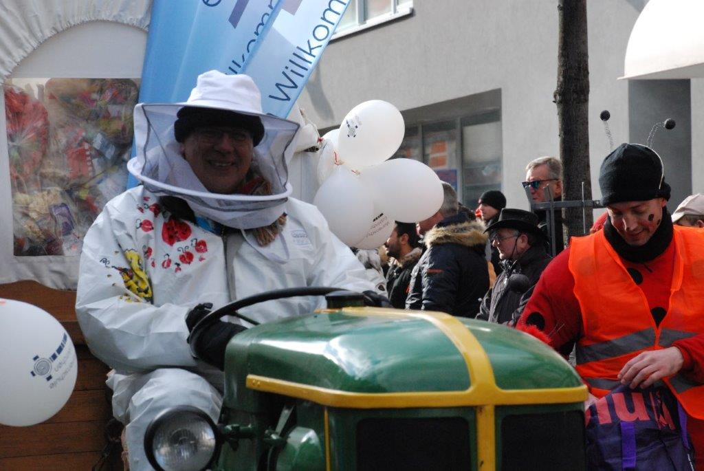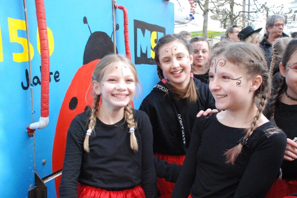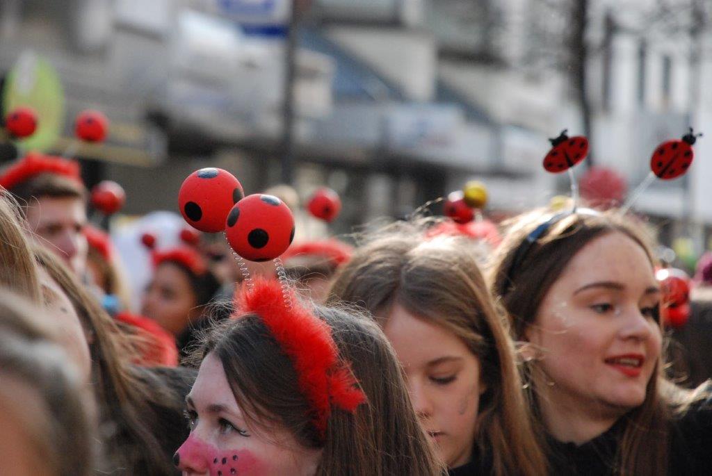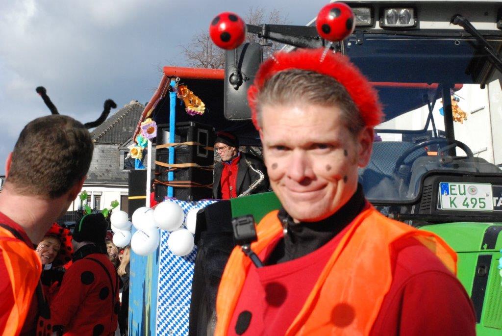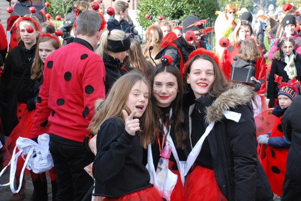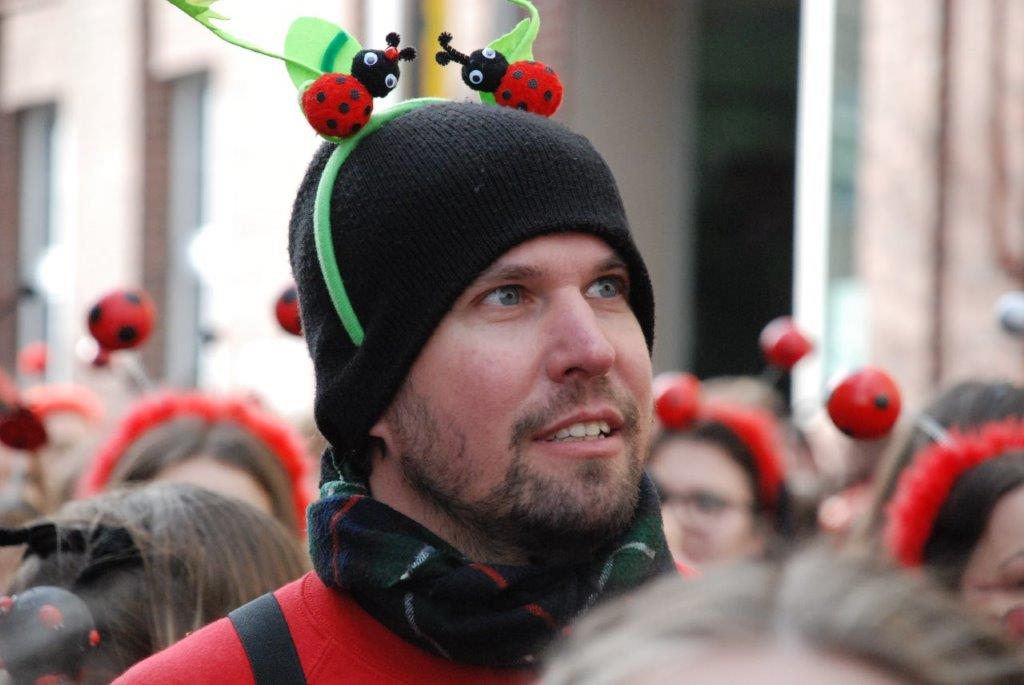 Ein Imker, der seine Bienen im Griff hat, ist keine Seltenheit. Jürgen Antwerpen, der Schulleiter der Marienschule Euskirchen, bewies am Montag jedoch, dass ein Bienenzüchter auch durchaus Talent im Umgang mit Marienkäfern haben kann. Mit Netzhut und Schutzanzug ausgestattet führte er den närrischen Tross auf seinem Oldtimer-Traktor an. Gefolgt von rund 200 Schülerinnen und Schülern in Käferkostümen begleitete er den Rosenmontagszug durch die Euskirchener Innenstadt. Doch nicht nur mit den großen Mengen Kamelle, die die Marienschüler unter den zu tausenden am Straßenrand wartenden Zuschauern verteilten, sorgten sie für Feierstimmung. Musiklehrer Jan Philipp Röser hatte zudem einige Mitglieder der Schulbigbands um sich versammelt und heizte den Euskirchener Jecken mit Live-Musik ein. „Bei einem Karnevalsumzug kommt die Musik oft vom Band“, schilderte Pressesprecher Otmar Dreifke seine Eindrücke. „Inmitten von all diesem närrischen Treiben die Bigband spielen zu hören war wirklich ein einmaliges Erlebnis.“ Ausgelassen zogen die schwarzgepunkteten Marienkäfer durch die Straßen und stimmten lautstark in die Liedvorträge der Bigband ein. „Alle waren von dem Geschehen begeistert“, so Dreifke. „Ich bin sicher, unsere Schüler werden ab sofort regelmäßig an den Euskirchener Karnevalszügen teilnehmen.“
