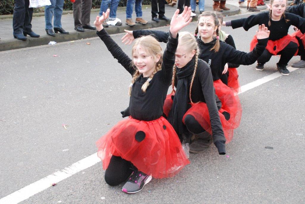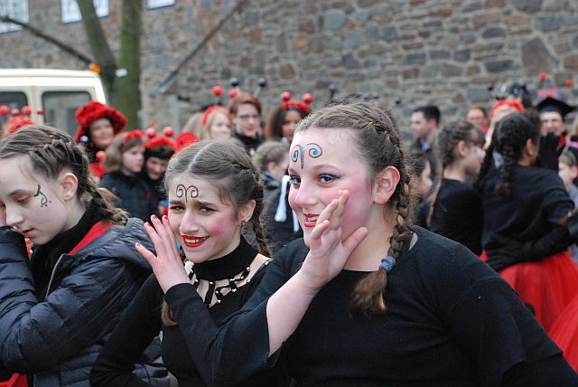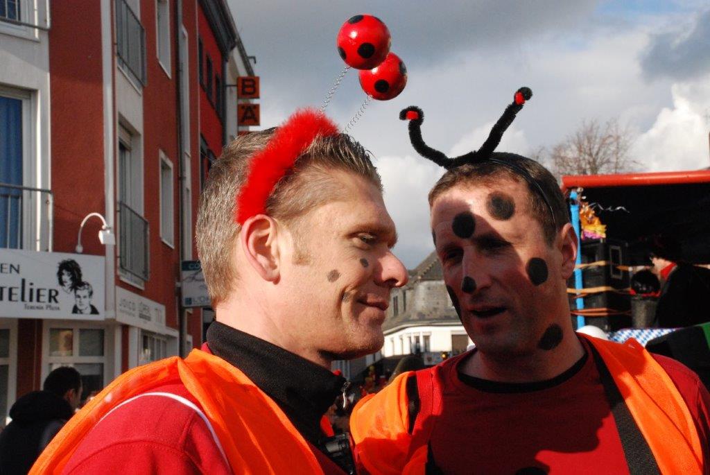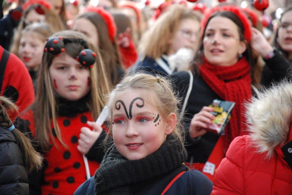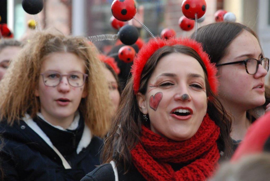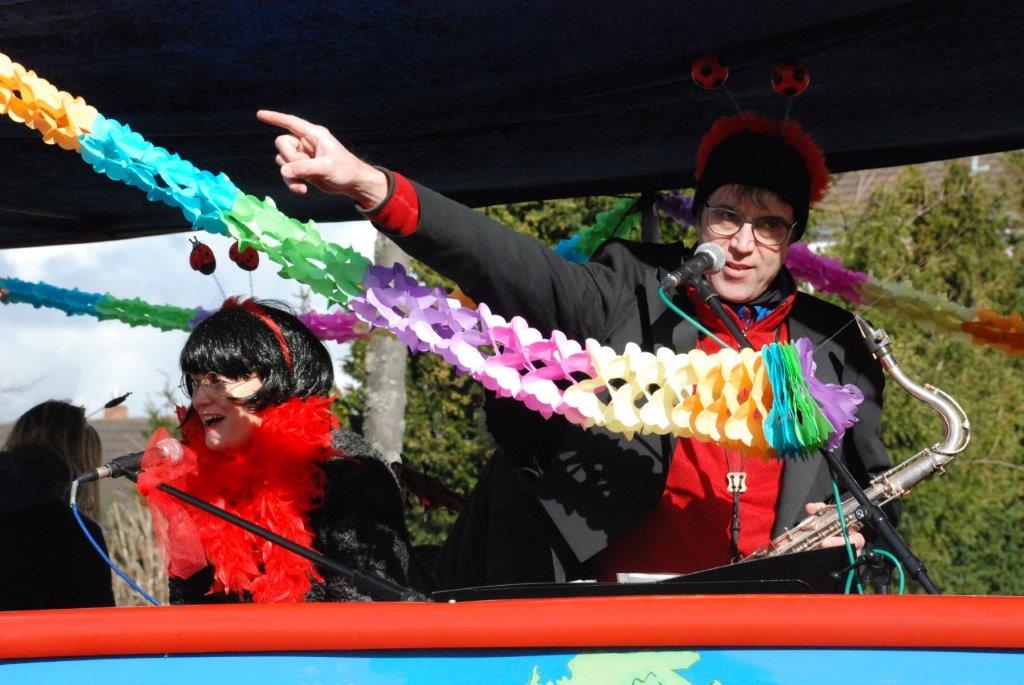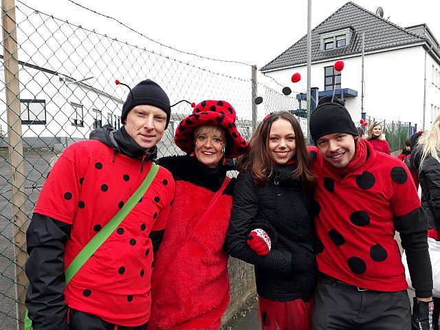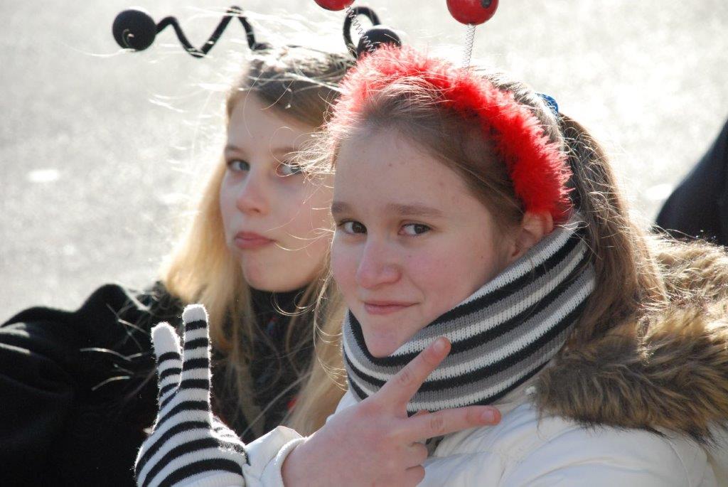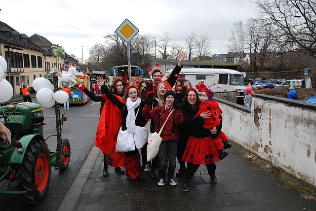Ein Imker, der seine Bienen im Griff hat, ist keine Seltenheit. Jürgen Antwerpen, der Schulleiter der Marienschule Euskirchen, bewies am Montag jedoch, dass ein Bienenzüchter auch durchaus Talent im Umgang mit Marienkäfern haben kann. Mit Netzhut und Schutzanzug ausgestattet führte er den närrischen Tross auf seinem Oldtimer-Traktor an. Gefolgt von rund 200 Schülerinnen und Schülern in Käferkostümen begleitete er den Rosenmontagszug durch die Euskirchener Innenstadt. Doch nicht nur mit den großen Mengen Kamelle, die die Marienschüler unter den zu tausenden am Straßenrand wartenden Zuschauern verteilten, sorgten sie für Feierstimmung. Musiklehrer Jan Philipp Röser hatte zudem einige Mitglieder der Schulbigbands um sich versammelt und heizte den Euskirchener Jecken mit Live-Musik ein. „Bei einem Karnevalsumzug kommt die Musik oft vom Band“, schilderte Pressesprecher Otmar Dreifke seine Eindrücke. „Inmitten von all diesem närrischen Treiben die Bigband spielen zu hören war wirklich ein einmaliges Erlebnis.“ Ausgelassen zogen die schwarzgepunkteten Marienkäfer durch die Straßen und stimmten lautstark in die Liedvorträge der Bigband ein. „Alle waren von dem Geschehen begeistert“, so Dreifke. „Ich bin sicher, unsere Schüler werden ab sofort regelmäßig an den Euskirchener Karnevalszügen teilnehmen.“