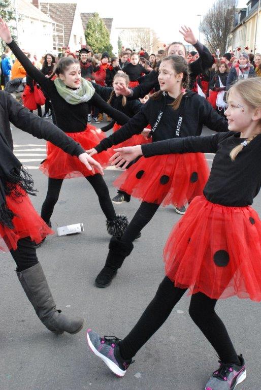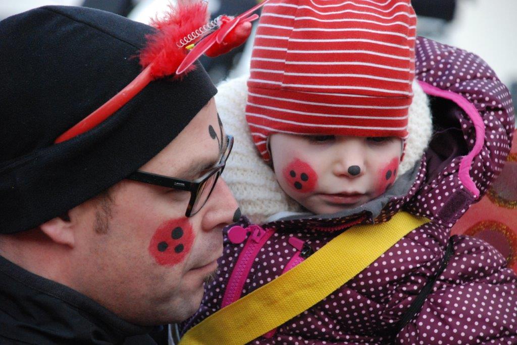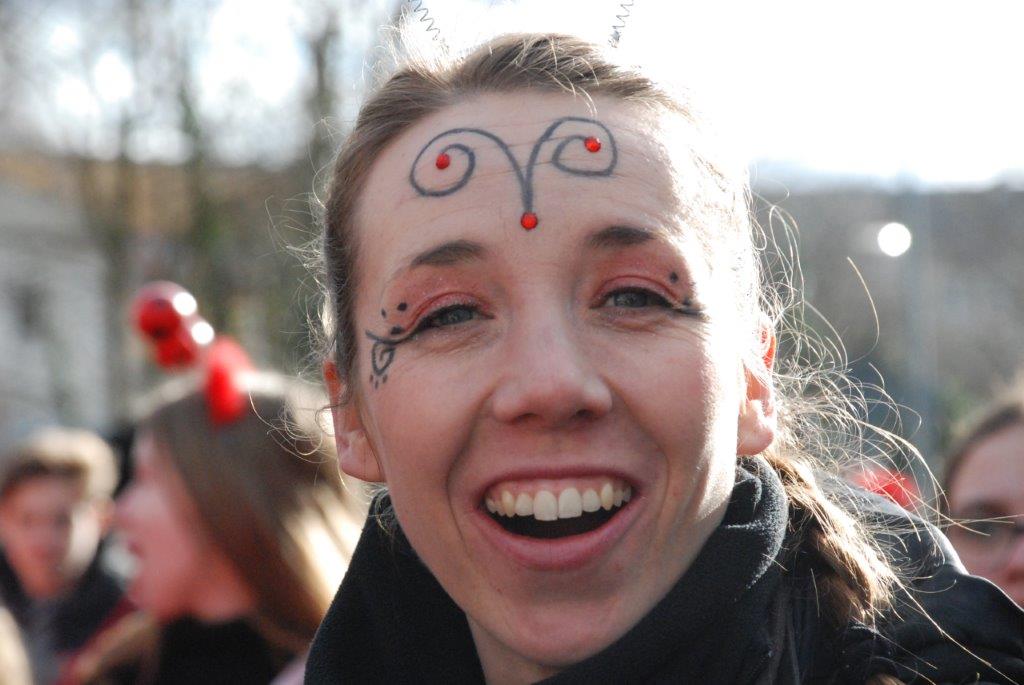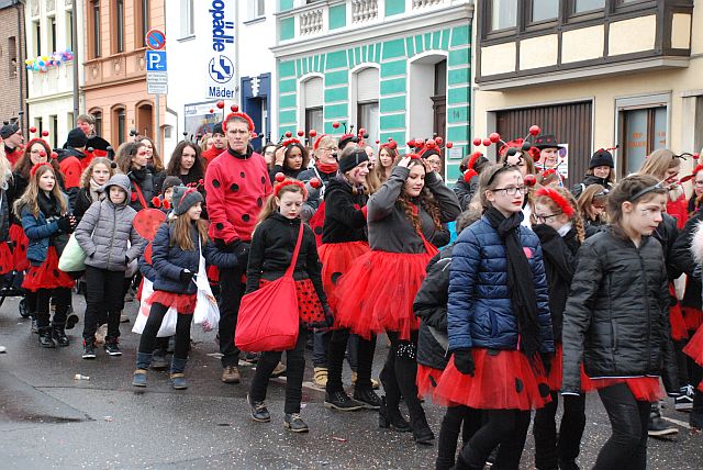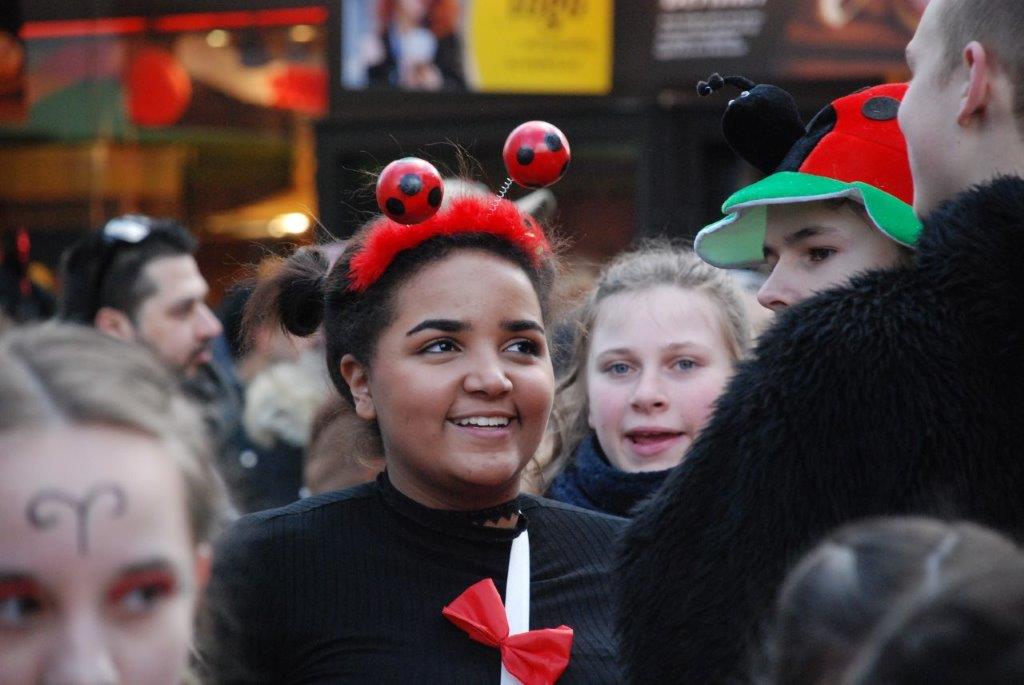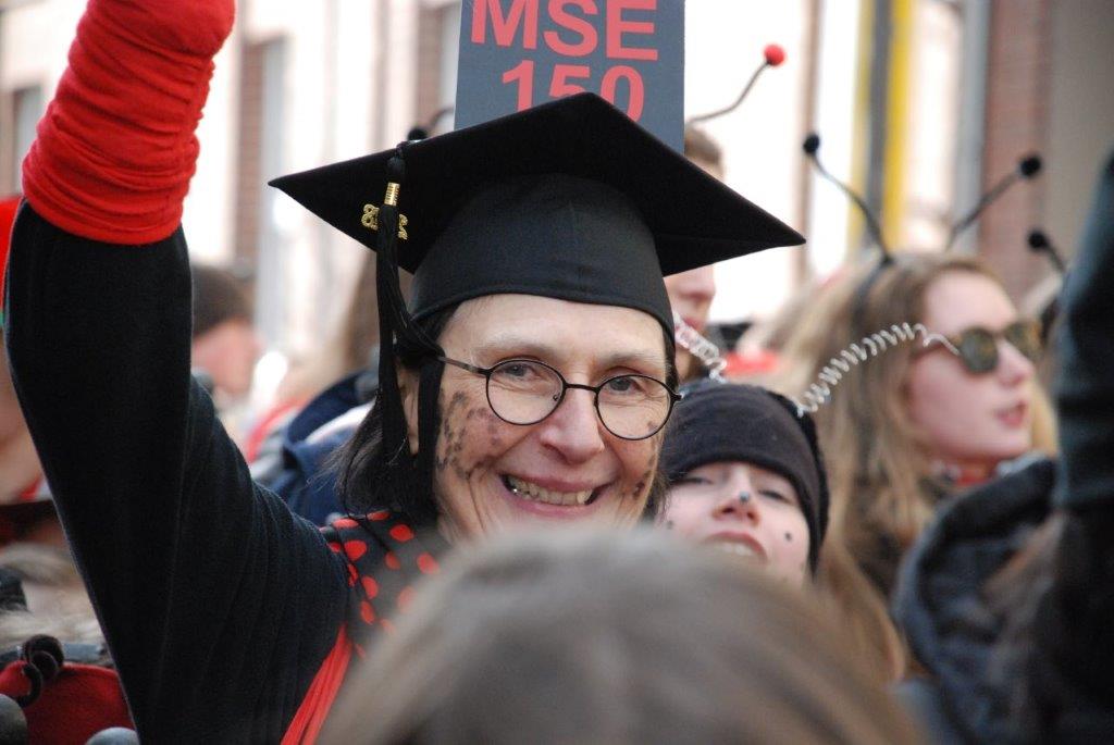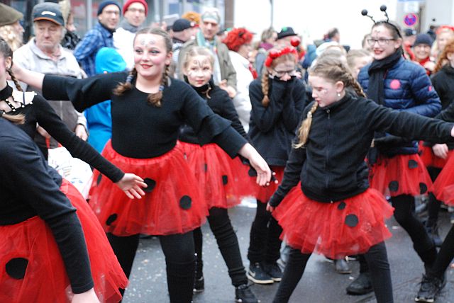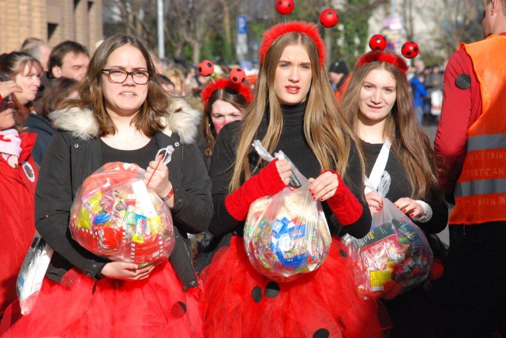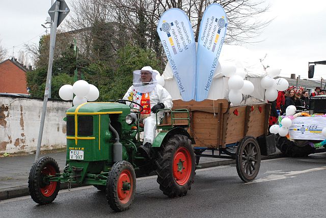 Ein Imker, der seine Bienen im Griff hat, ist keine Seltenheit. Jürgen Antwerpen, der Schulleiter der Marienschule Euskirchen, bewies am Montag jedoch, dass ein Bienenzüchter auch durchaus Talent im Umgang mit Marienkäfern haben kann. Mit Netzhut und Schutzanzug ausgestattet führte er den närrischen Tross auf seinem Oldtimer-Traktor an. Gefolgt von rund 200 Schülerinnen und Schülern in Käferkostümen begleitete er den Rosenmontagszug durch die Euskirchener Innenstadt. Doch nicht nur mit den großen Mengen Kamelle, die die Marienschüler unter den zu tausenden am Straßenrand wartenden Zuschauern verteilten, sorgten sie für Feierstimmung. Musiklehrer Jan Philipp Röser hatte zudem einige Mitglieder der Schulbigbands um sich versammelt und heizte den Euskirchener Jecken mit Live-Musik ein. „Bei einem Karnevalsumzug kommt die Musik oft vom Band“, schilderte Pressesprecher Otmar Dreifke seine Eindrücke. „Inmitten von all diesem närrischen Treiben die Bigband spielen zu hören war wirklich ein einmaliges Erlebnis.“ Ausgelassen zogen die schwarzgepunkteten Marienkäfer durch die Straßen und stimmten lautstark in die Liedvorträge der Bigband ein. „Alle waren von dem Geschehen begeistert“, so Dreifke. „Ich bin sicher, unsere Schüler werden ab sofort regelmäßig an den Euskirchener Karnevalszügen teilnehmen.“