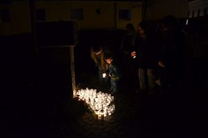 Den Abschluss der Gedenkveranstaltung gestalteten Pfarrer Edgar Hoffmann als Vertreter der evangelischen und der pastorale Referent Robert Sins der katholischen Gemeinden Euskirchens. In einem gemeinsamen Gebet gedachten die beiden Geistlichen der Opfer des Holocausts und führten anschließend die Lichterprozession zum Denkmal der ermordeten jüdischen Mitbürger auf dem Annaturmplatz. Dort, wo einmal die Synagoge stand, erwiesen die Anwesenden durch ein auf Deutsch von Pfarrer Hoffmann vorgetragenes jüdisches Gebet und eine Schweigeminute, ihre Ehre.