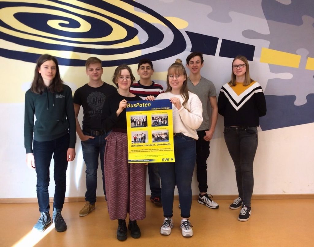Hallo, wir sind die neuen Buspaten der Marienschule! Wir, das sind (von links nach rechts) Luke (Buslinien: 985, 871), David (Buslinien: 808, 878, 810), Frieda (Buslinien: 298, 774, 871), Eray…