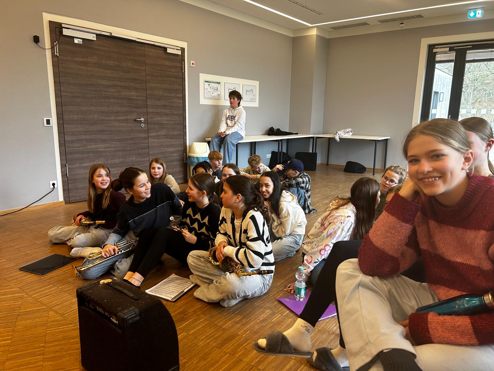 In Gemünd angekommen hieß es zunächst: ausladen, schleppen, aufbauen. Pünktlich um 10:30 Uhr begann die erste Probephase. Mit viel Konzentration und hörbarer Begeisterung arbeiteten die jungen Musikerinnen und Musiker an ihrem Repertoire. Auch nach dem Mittagessen wurde intensiv weitergeprobt. Selbst am Abend erklangen noch Bläsersätze und Rhythmusgrooves durch die Räume der Jugendherberge – nur unterbrochen vom Beziehen der Zimmer und einer kurzen Einheit an der frischen Luft, um neue Energie zu tanken.