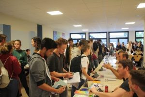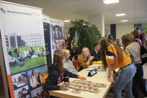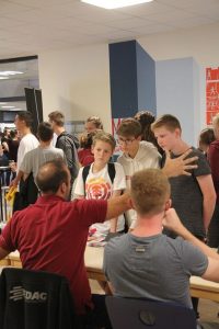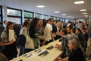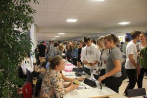 Das Interesse ins Ausland zu gehen scheint bei den Schülerinnen und Schülern beträchtlich zu sein. Das zeigt der große Andrang beim Vortrag von „Education first“: „Wege ins Ausland für Schülerinnen und Schüler aller Altersgruppen“, der von unserer ehemaligen Schülerin Jana Hübner gehalten wird. Weitere Vorträge bieten der Rhein-Ahr-Campus zum BWL-Studium in Remagen und die Macromedia-Hochschule in Köln zu Berufen in der Medienbranche an, auf die sich die Oberstufenschülerinnen und Schüler verteilen. In der Mensa finden derweil angeregte Gespräche zwischen den Ehemaligen statt, bevor der große Marktplatz losgeht.