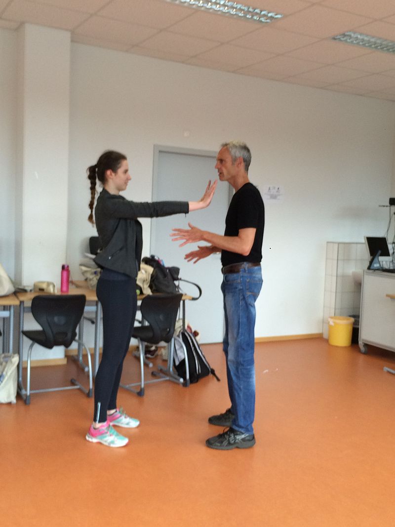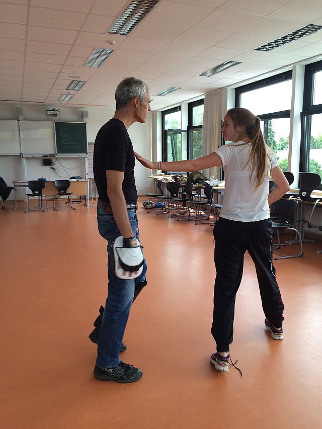 Deshalb lernten wir durch Haltung und Worten den „Täter“ auf Abstand zu halten, wobei Herr Stoffel die verschiedensten Situationen demonstrierte.