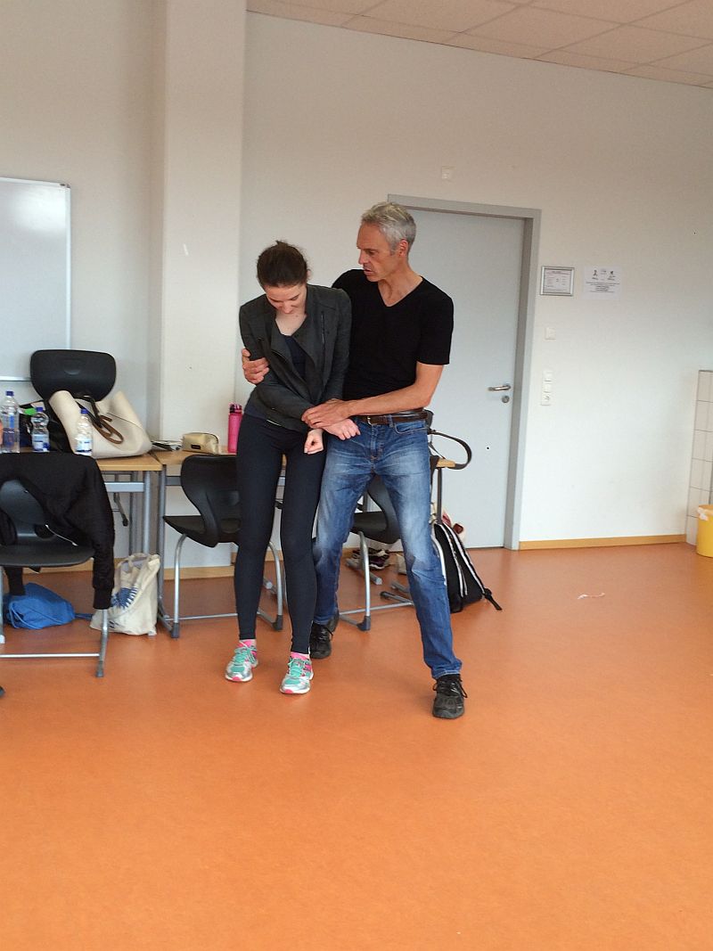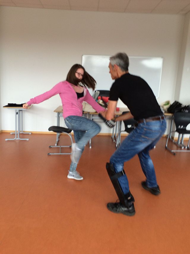 Sein Seminar bestand aus einem theoretischen Teil sowie einem praktischen Teil, in dem wir das neu-erlernte Programm („Schienbein, Schienbein, Unterleib, Unterleib, Kopf, Kopf“) an Herrn Stoffel mit Schutzkleidung anwenden durften.