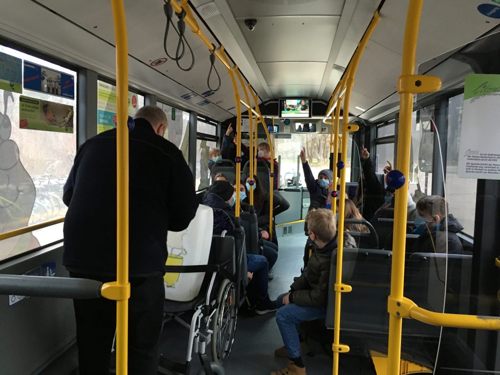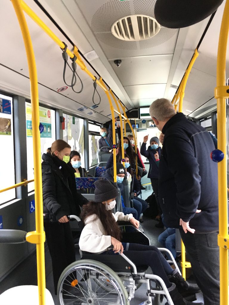 - Der Rollstuhlfahrer muss während der Fahrt mit einem Gurt befestigt werden. Dabei wurde eine von uns in den Rollstuhl gesetzt und die anderen durften sie befestigen und richtig aus dem Bus herausfahren.