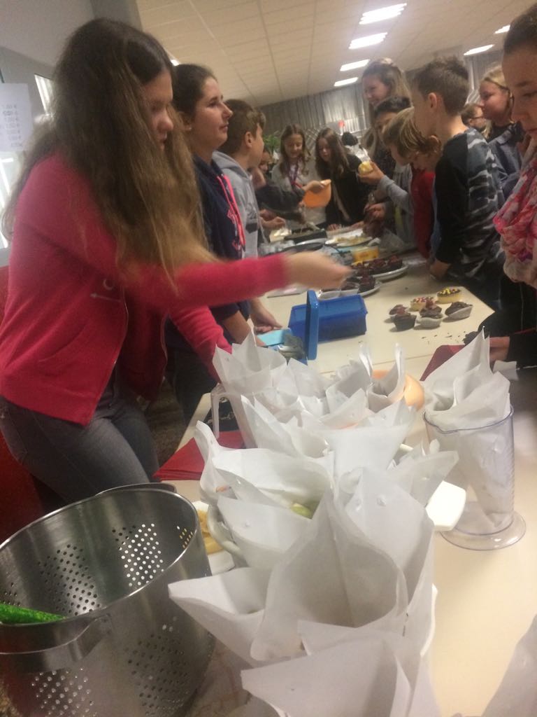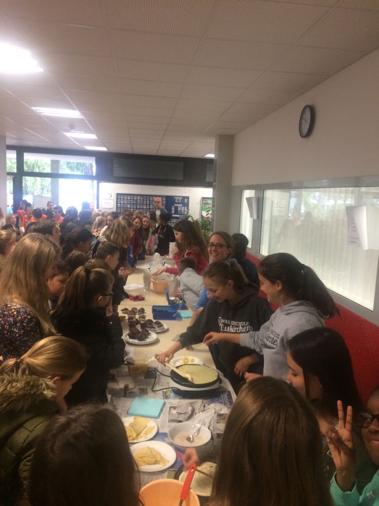 Mit Eifer wurden von den Schülerinnen und Schüler vorher Popcorn, Cupcakes, Brownies und Co hergestellt bzw. gebacken. Der Andrang war dementsprechend groß, als diese süßen Verführungen neben Crêpes, Obsttüten und Zuckerwatte verkauft wurden.  Der Ansturm war so enorm, dass bald der Crêpes-Teig leer war und in Windeseile  noch Popcorn nachgemacht werden musste. Am Ende aber war der Kurs glücklich darüber, dass sie in dieser kurzen Zeit 250 Euro eingenommen hatten, die jetzt an das World Food Programme gespendet werden. Diese Organisation bekämpft weltweit besonders den Hungern von Kindern.